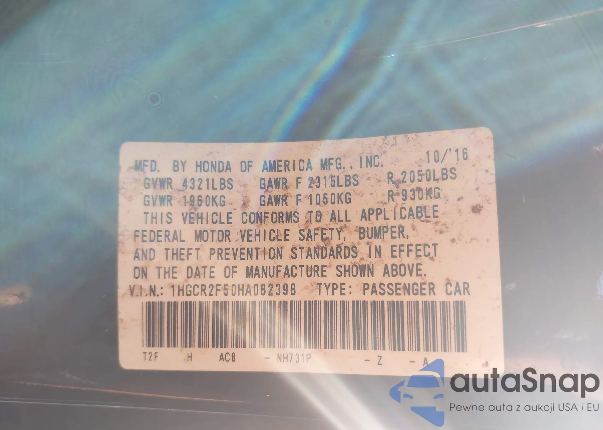 LOT: 42741225 VIN: 1HGCR2F50HA082398