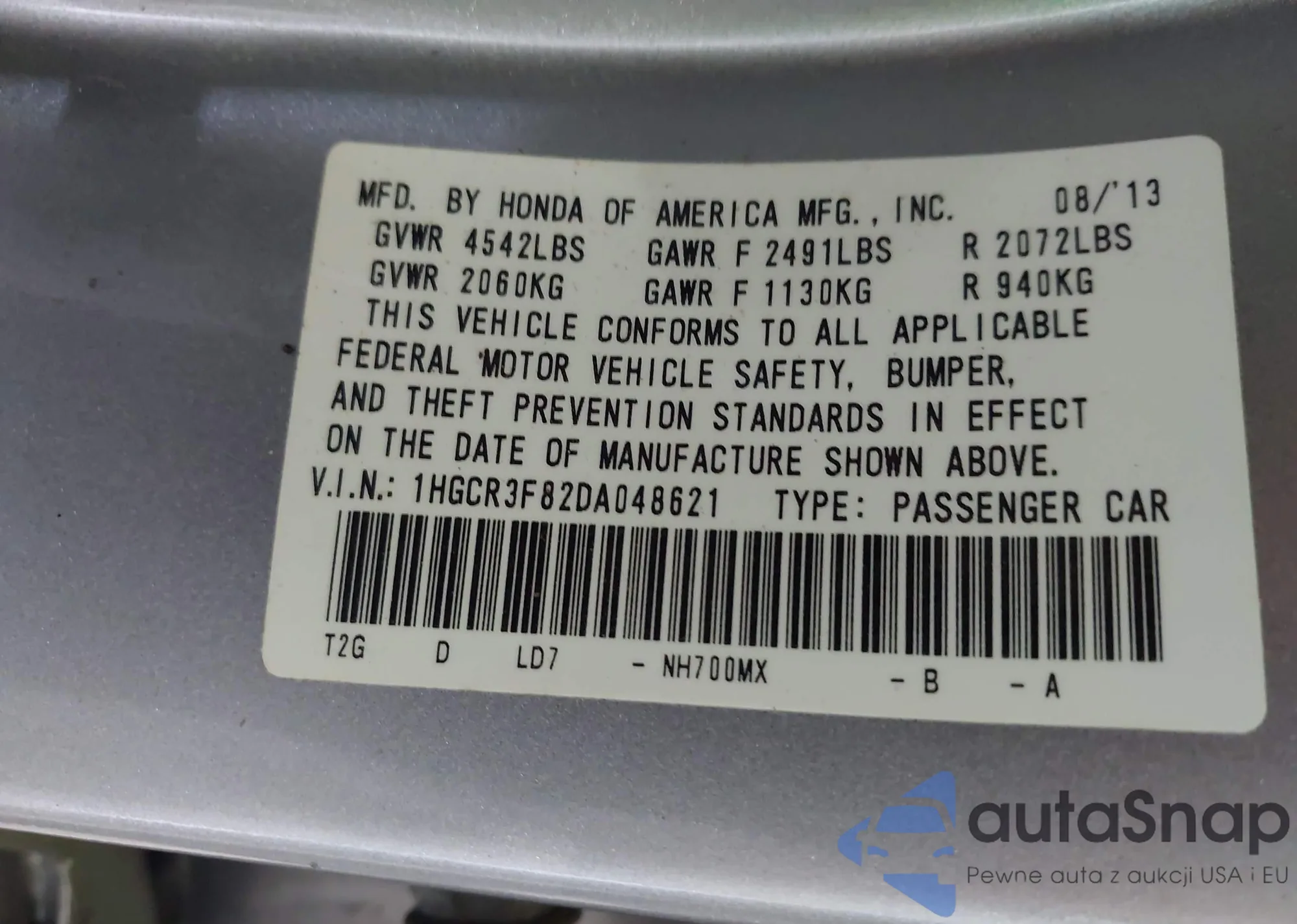 LOT: 43010403 VIN: 1HGCR3F82DA048621
