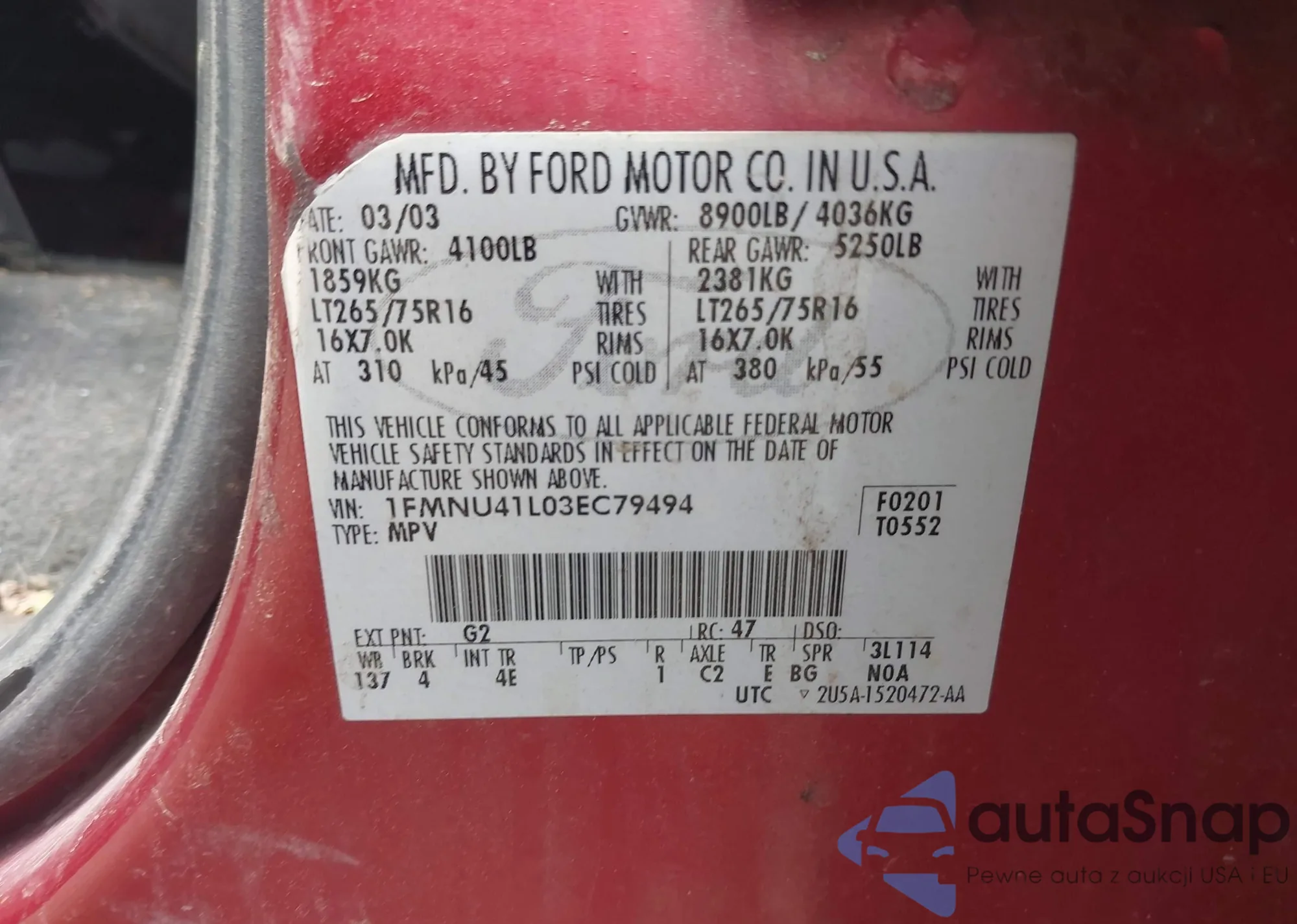 LOT: 42735863 VIN: 1FMNU41L03EC79494