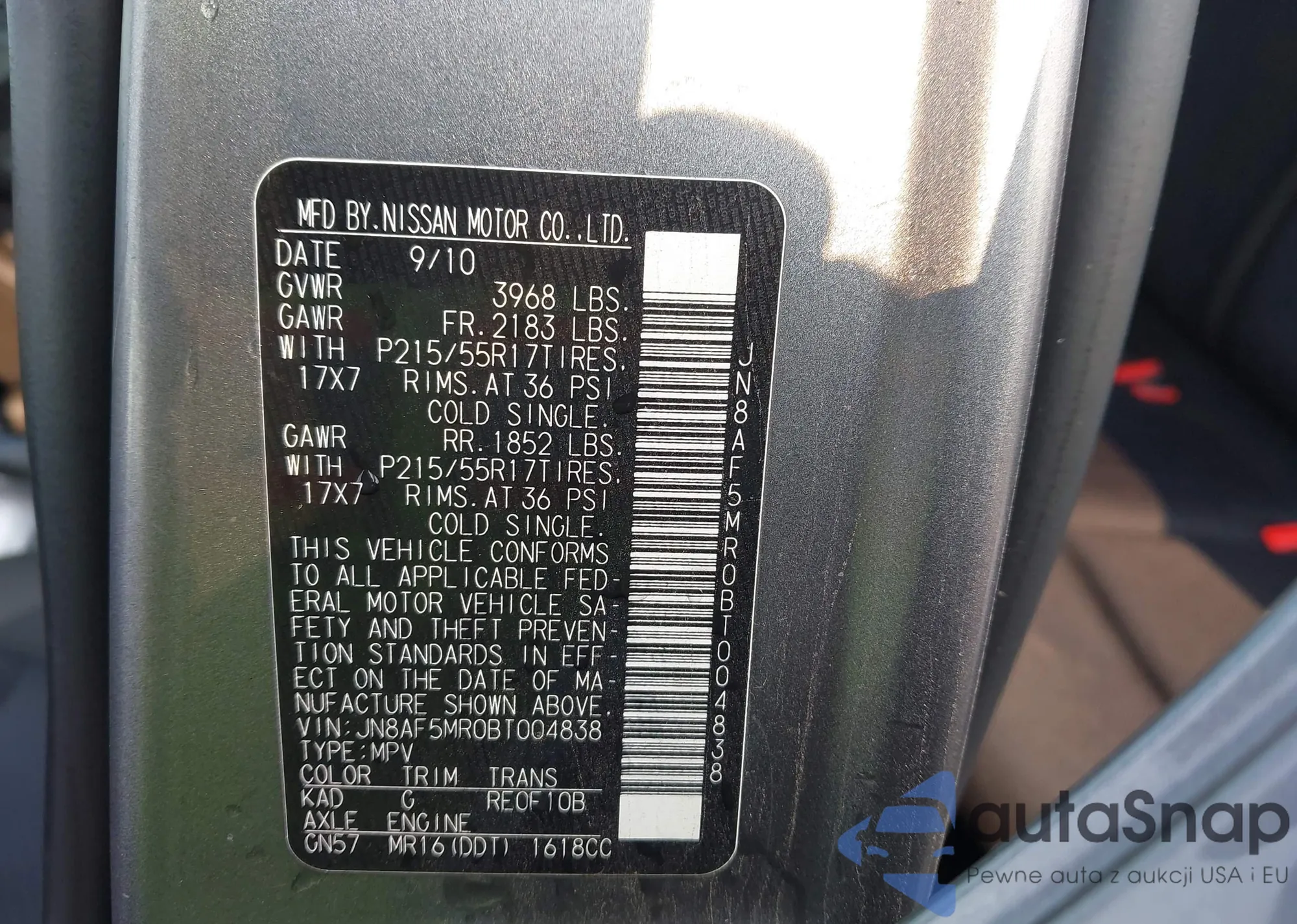 LOT: 43142301 VIN: JN8AF5MR0BT004838