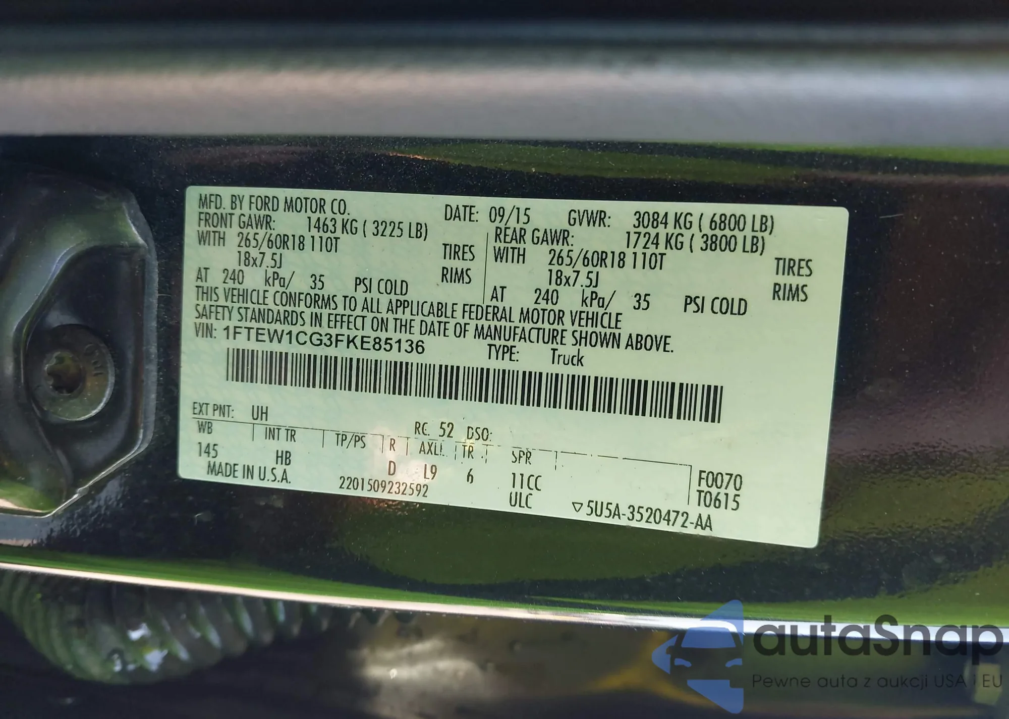 LOT: 43082413 VIN: 1FTEW1CG3FKE85136