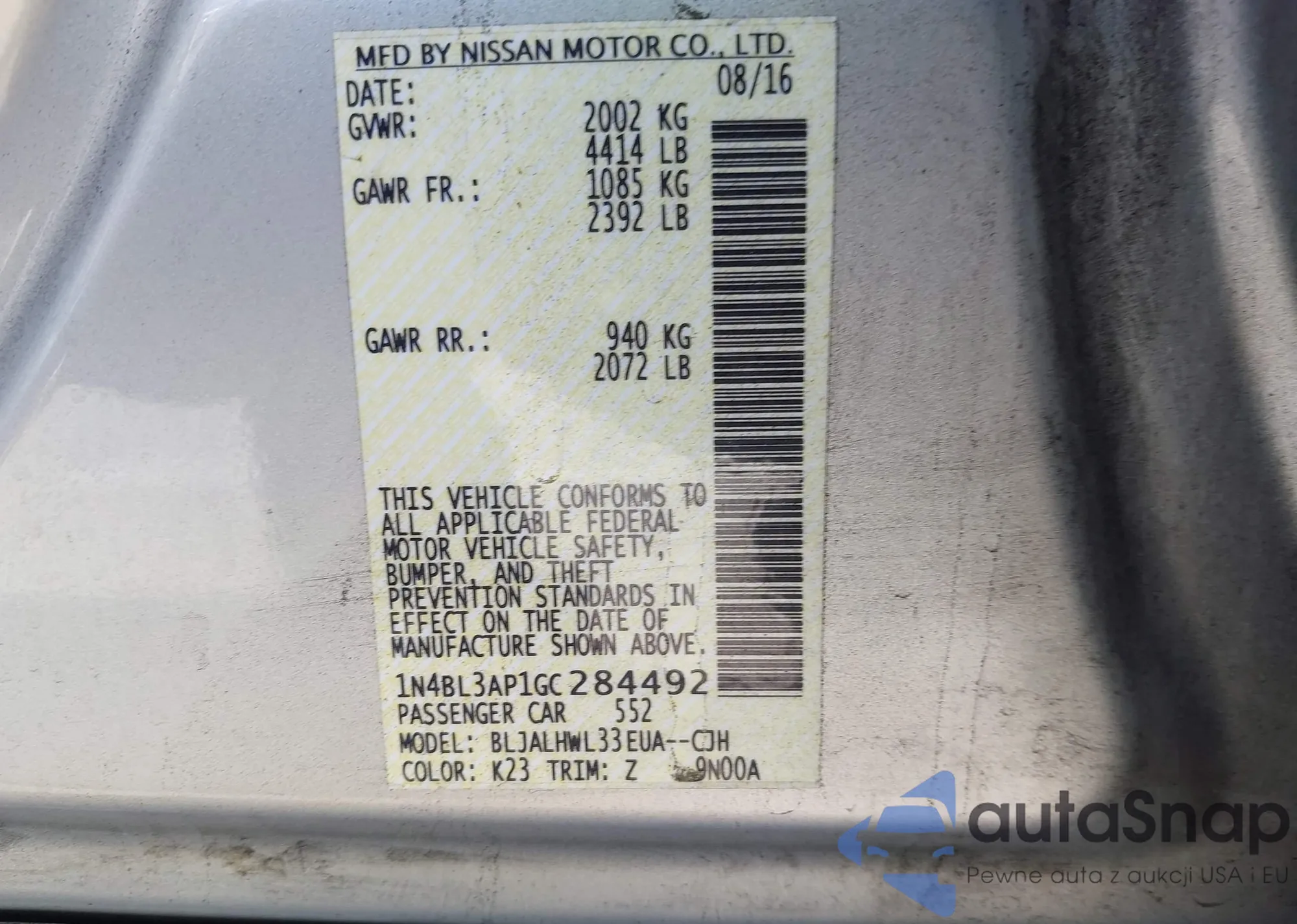 • VIN 1N4BL3AP1GC284492