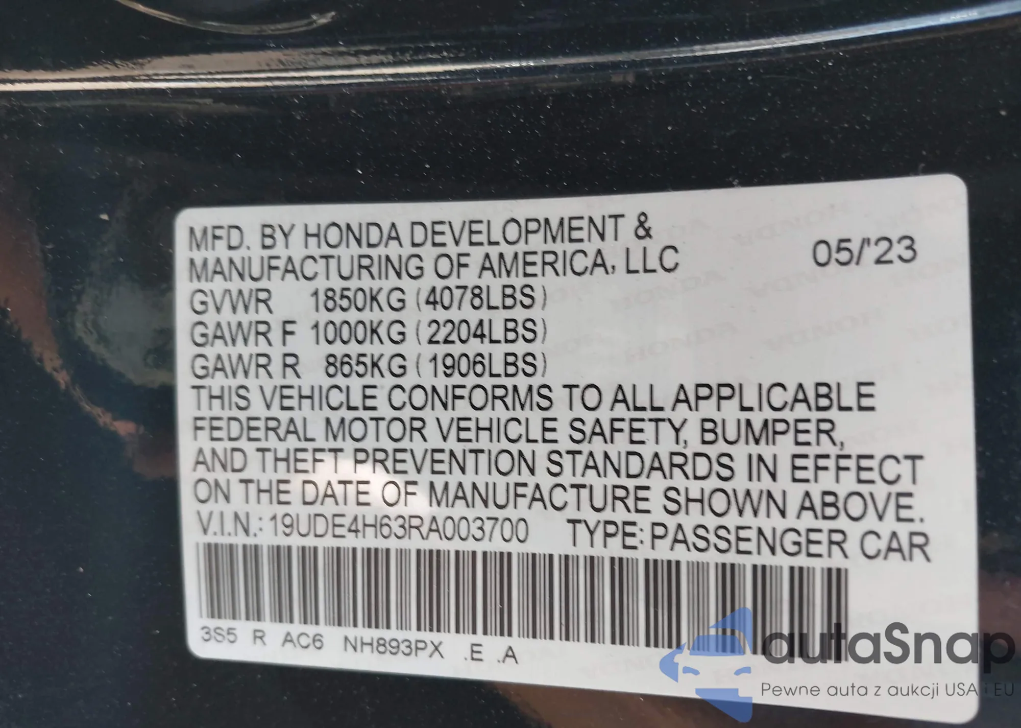 • VIN 19UDE4H63RA003700