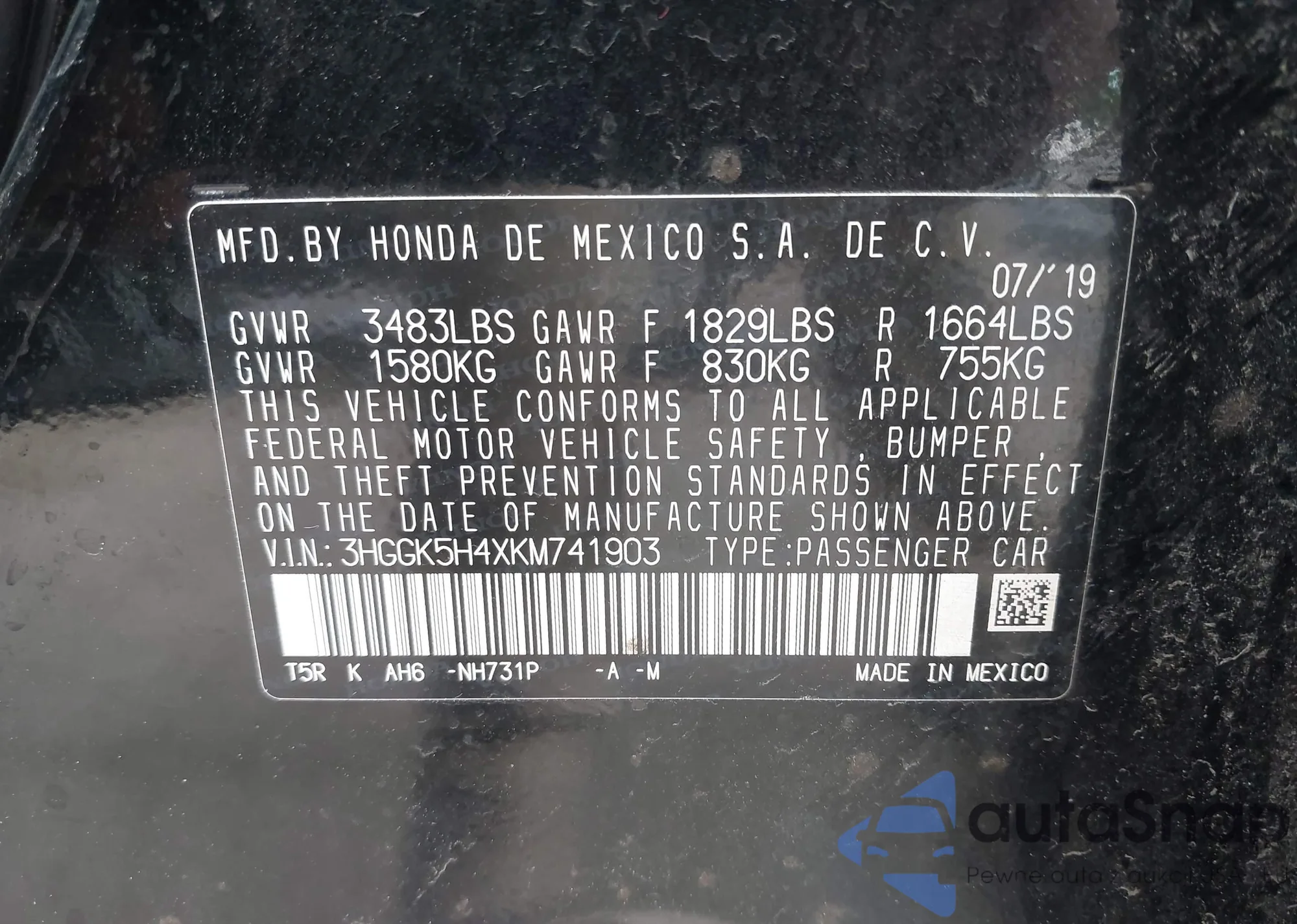 LOT: 43102012 VIN: 3HGGK5H4XKM741903