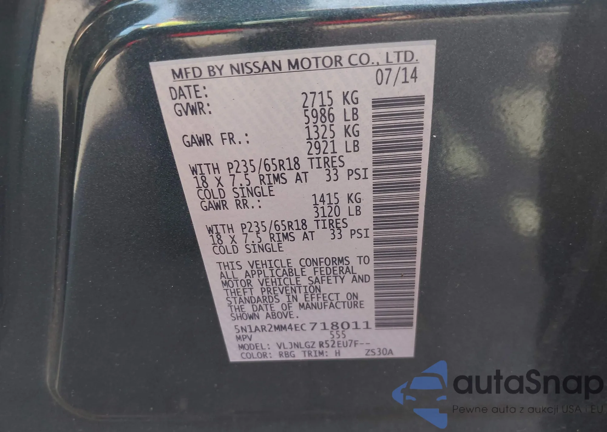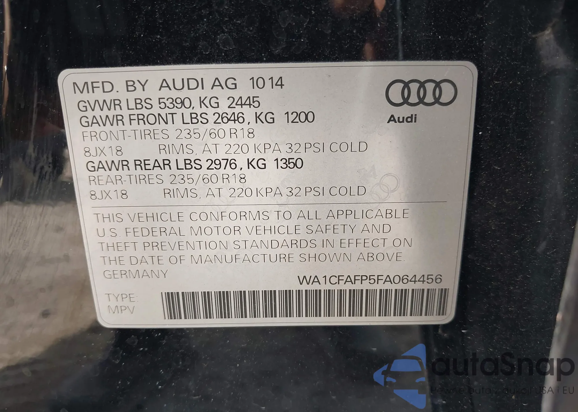 LOT: 43102056 VIN: WA1CFAFP5FA064456