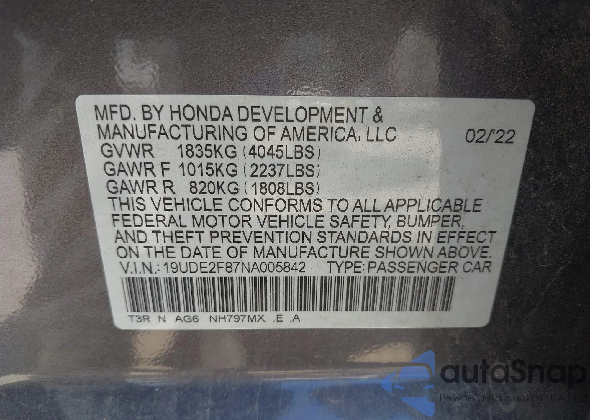 LOT: 43134778 VIN: 1HGCR2F35HA172967