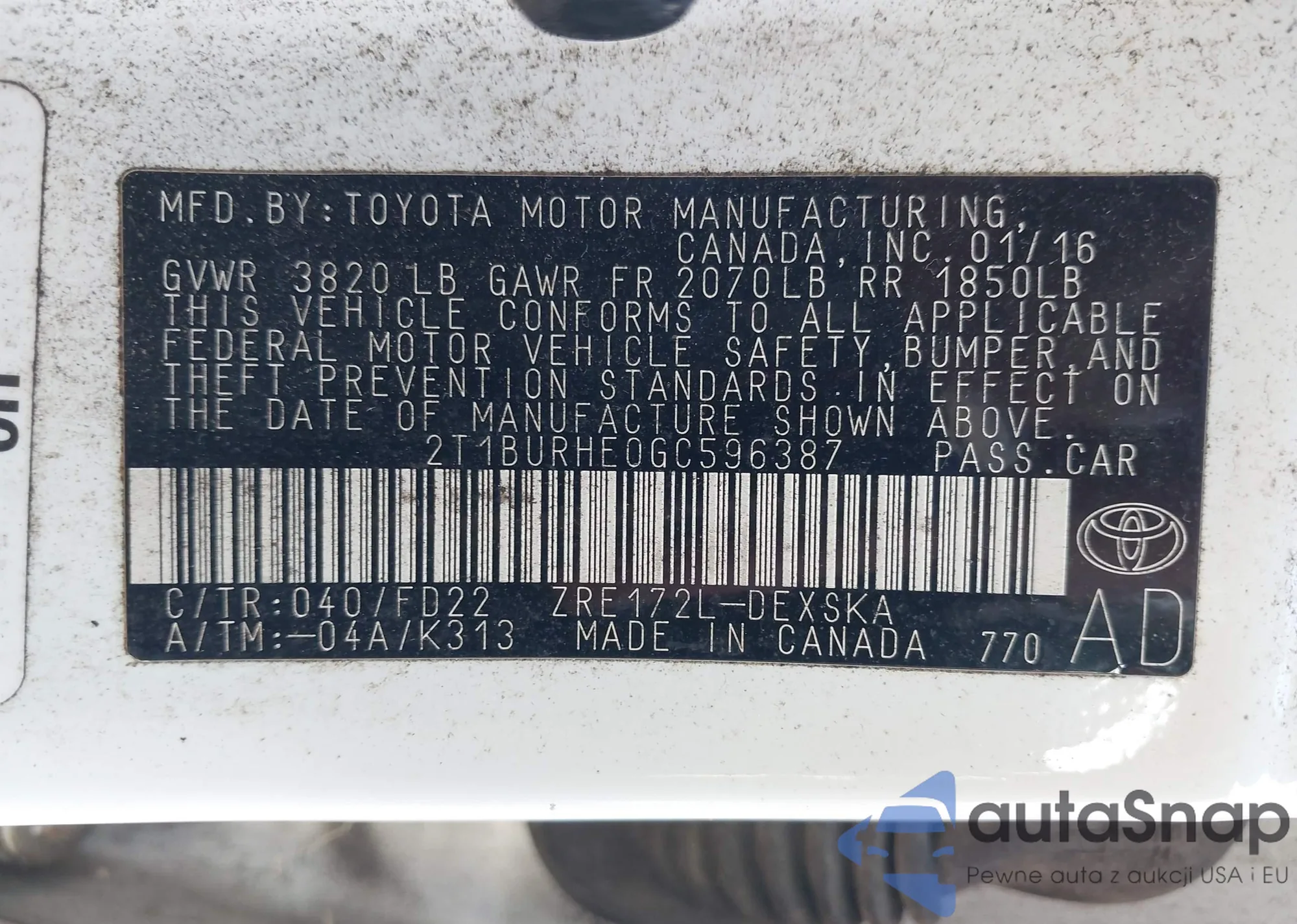 LOT: 43230589 VIN: 2T1BURHE0GC596387