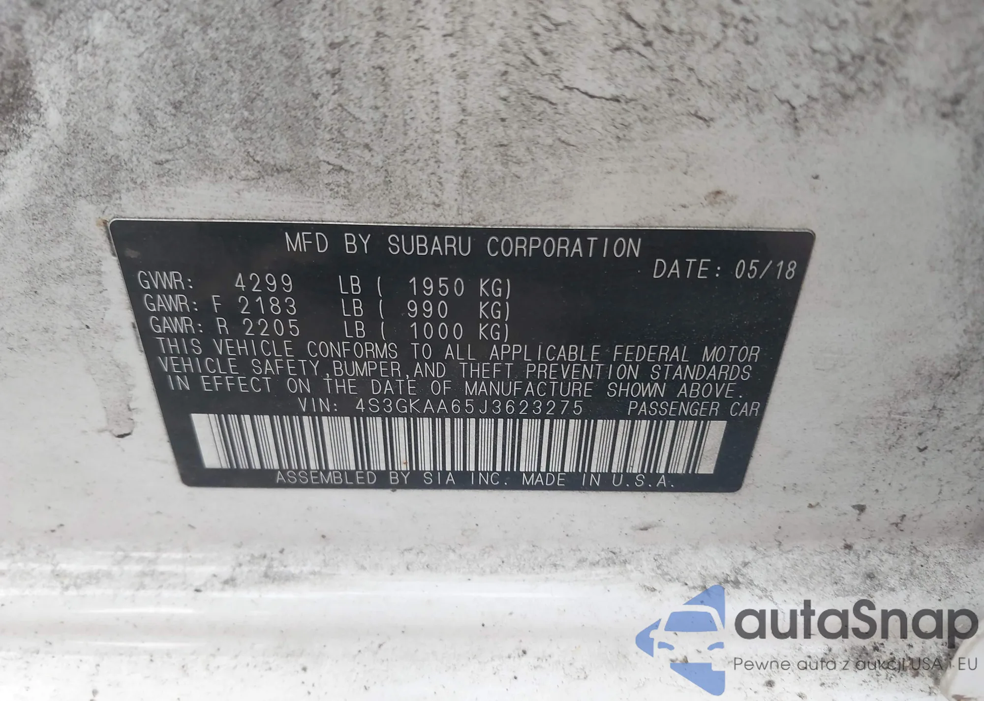 2018 Subaru Impreza 2.0I z USA, uszkodzony, nr VIN 4S3GKAA65J3623275