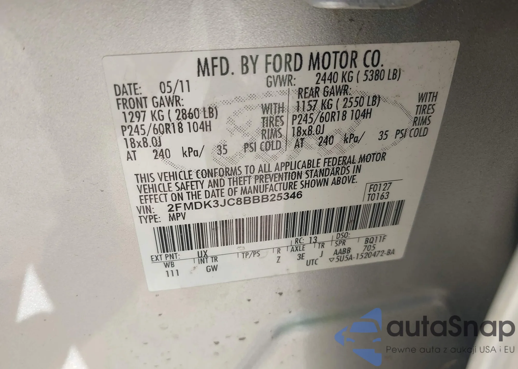 LOT: 43096645 VIN: 2FMDK3JC8BBB25346