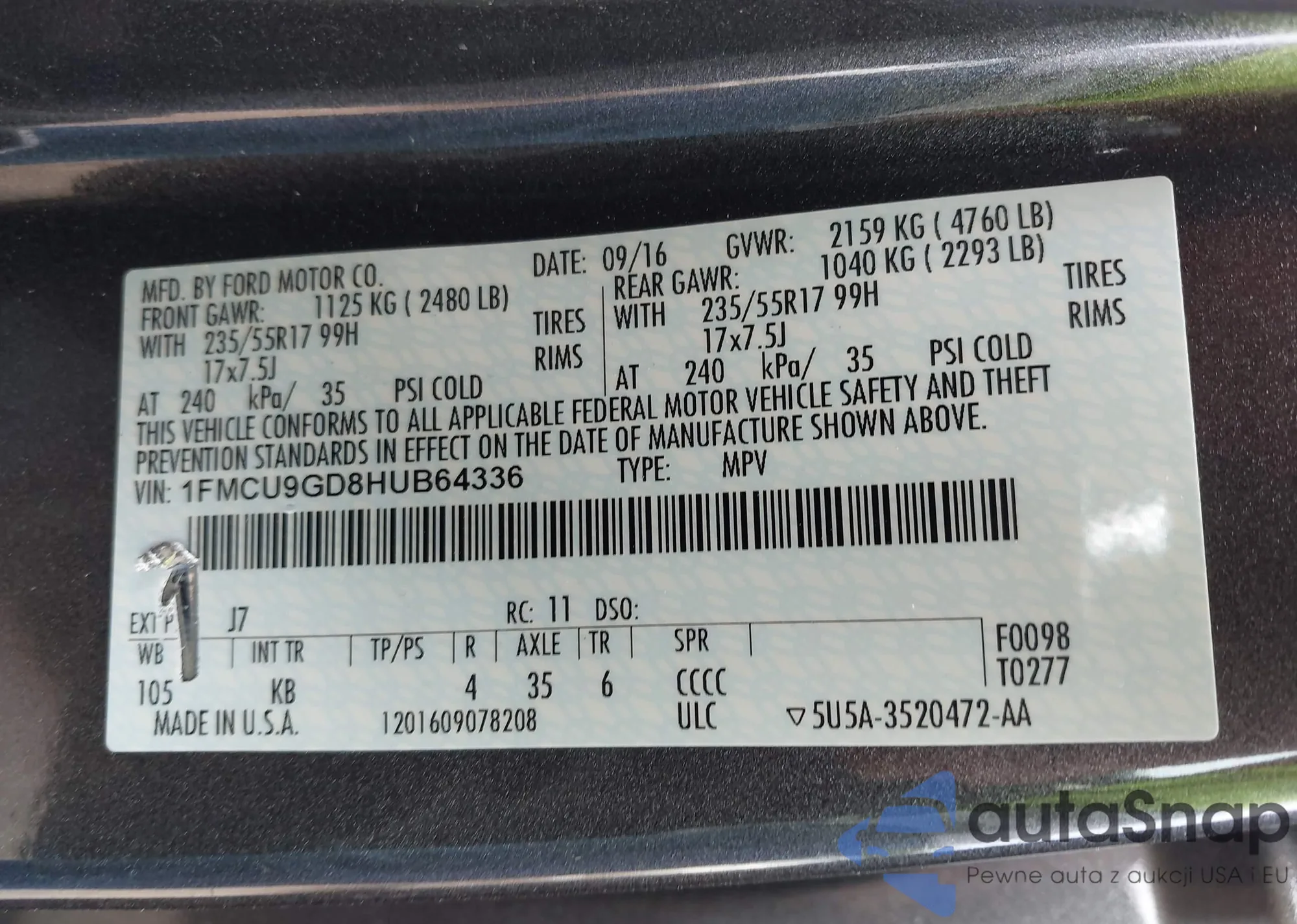 LOT: 42908458 VIN: 1FMCU9GD8HUB64336
