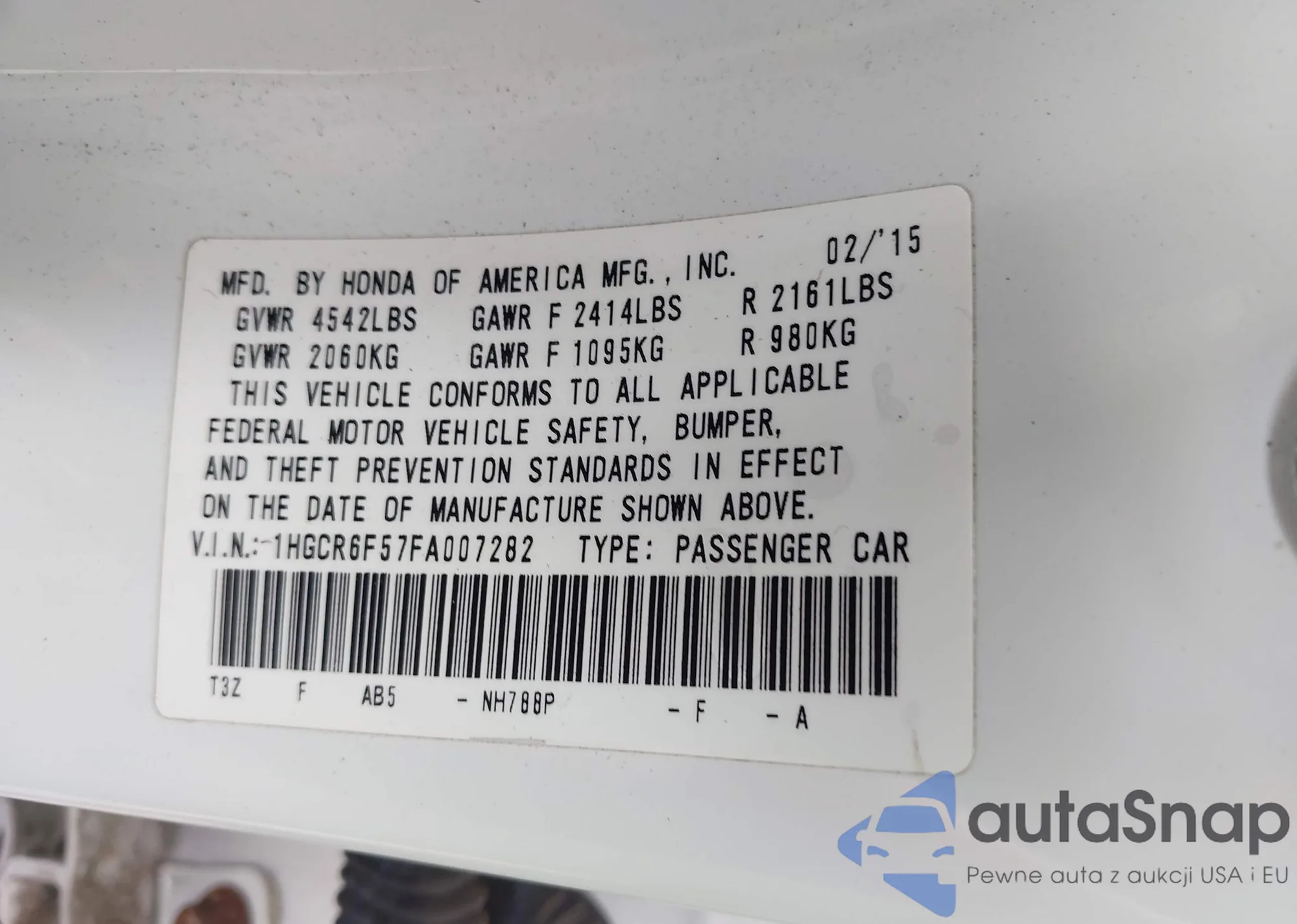 LOT: 42992188 VIN: 1HGCR6F57FA007282