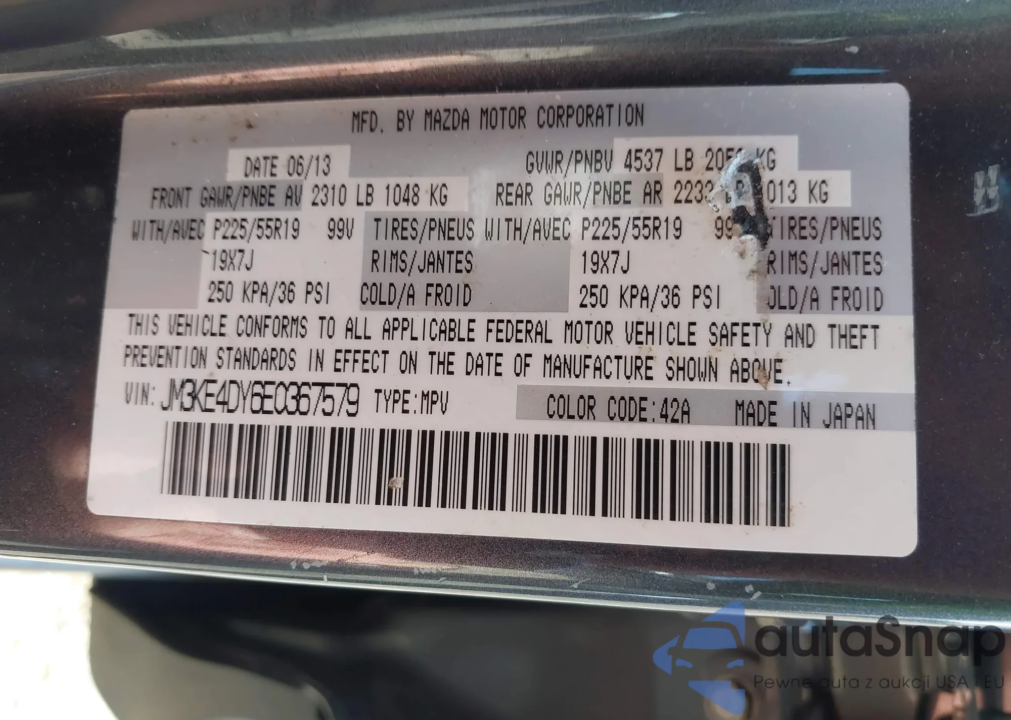 LOT: 43106448 VIN: JM3KE4DY6E0367579