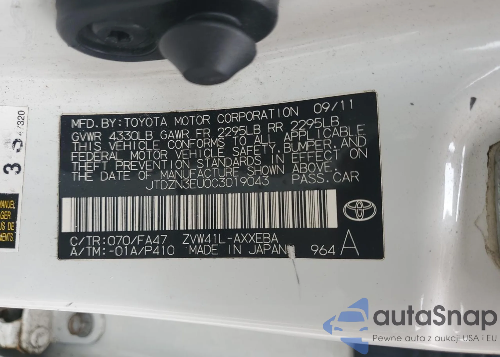 LOT: 67223025 VIN: JTDZN3EU0C3019043