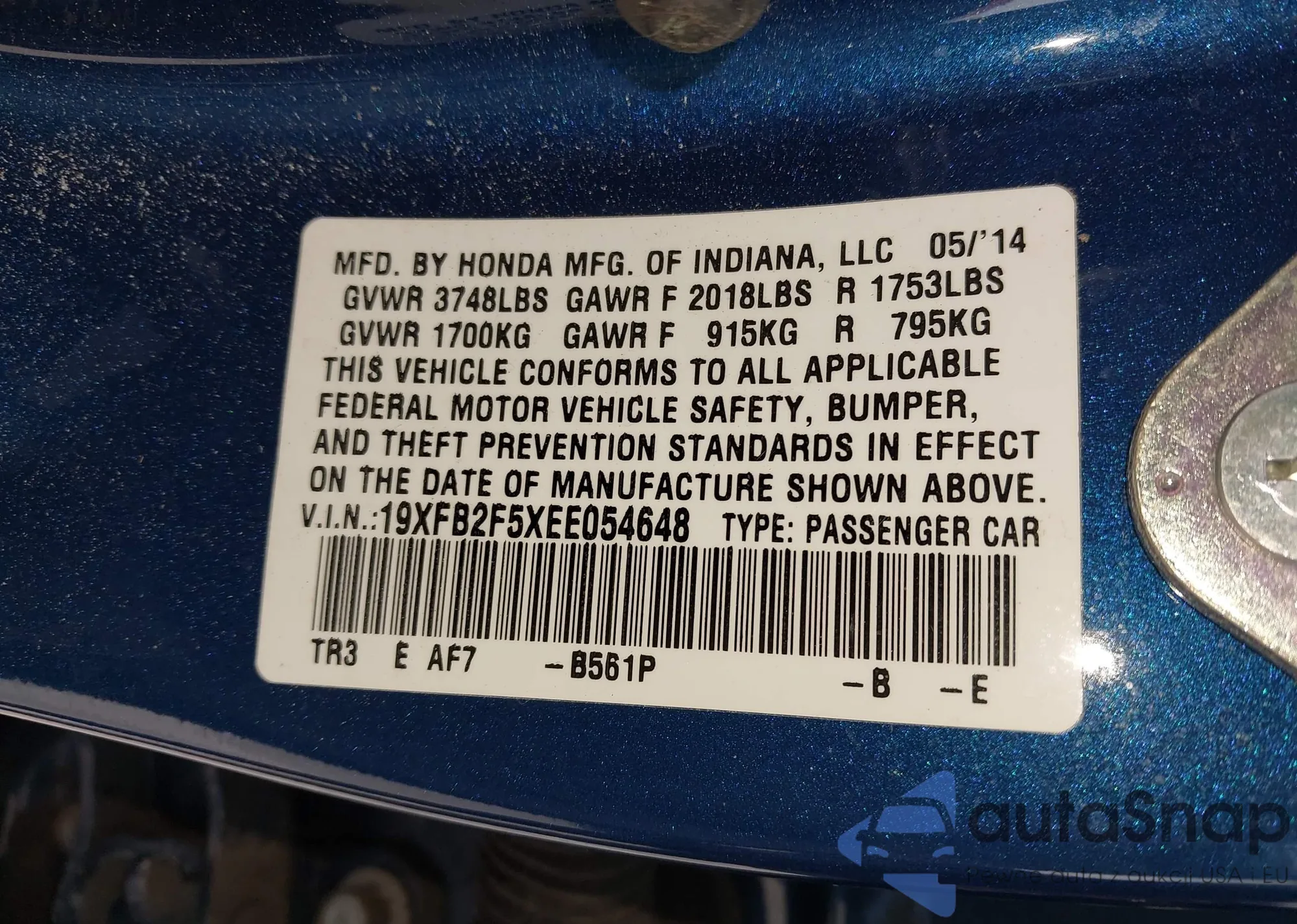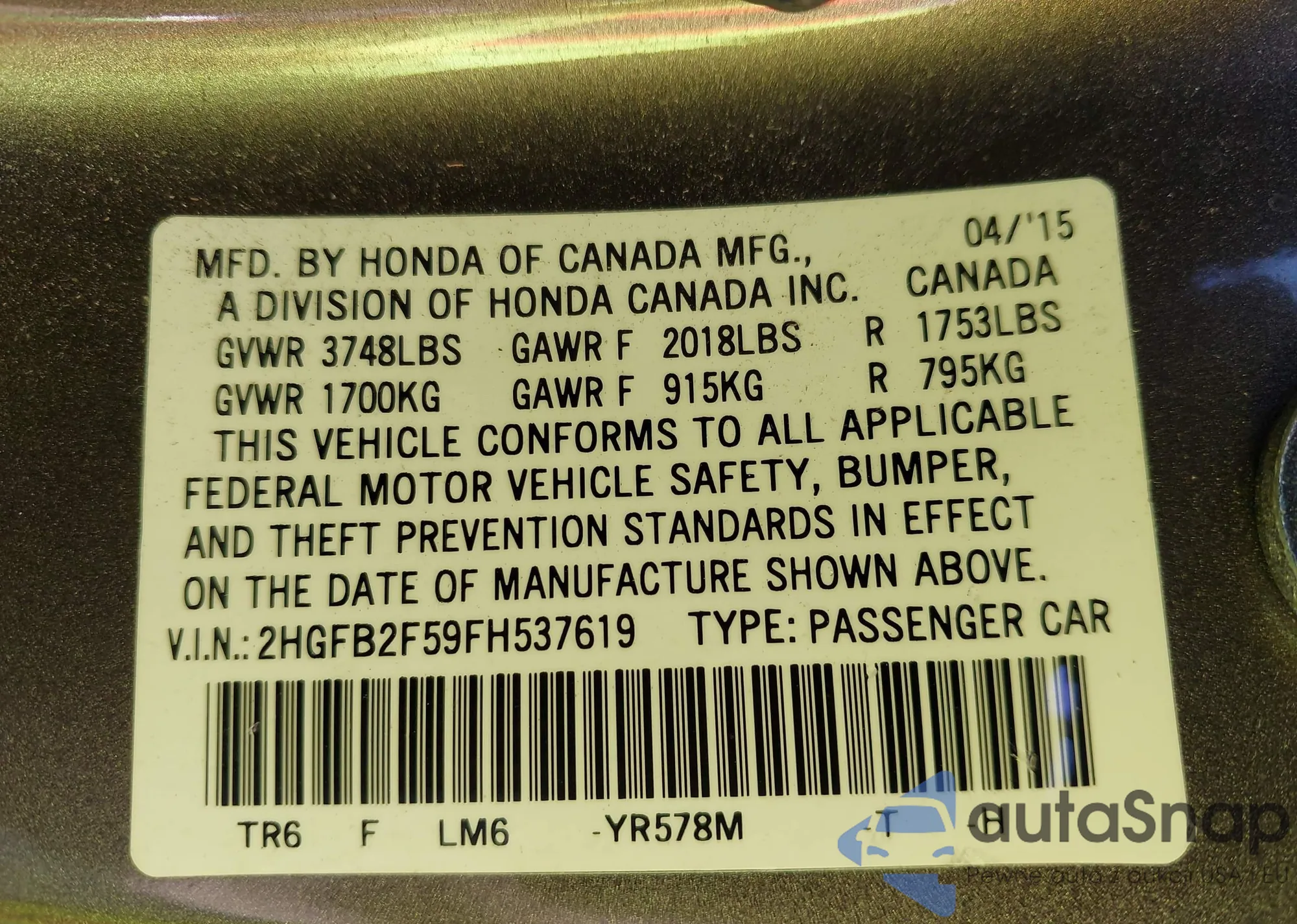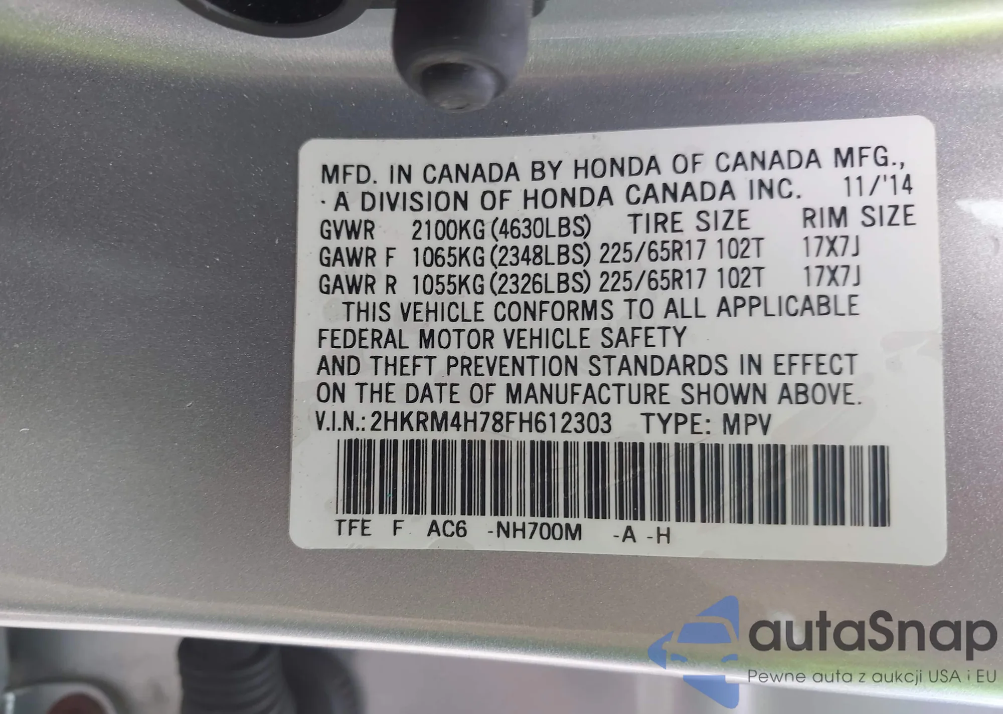 • VIN 2HKRM4H78FH612303