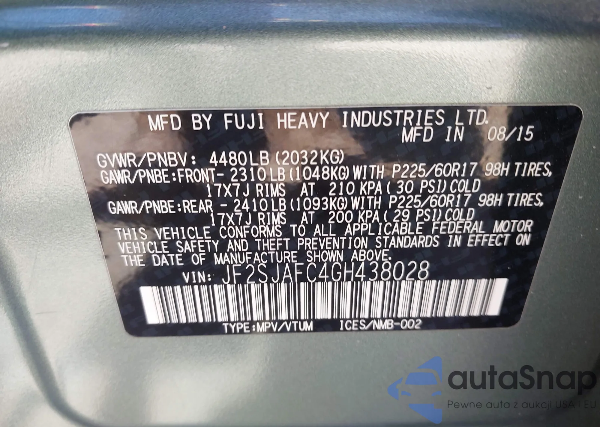 LOT: 43124111 VIN: JF2SJAFC4GH438028