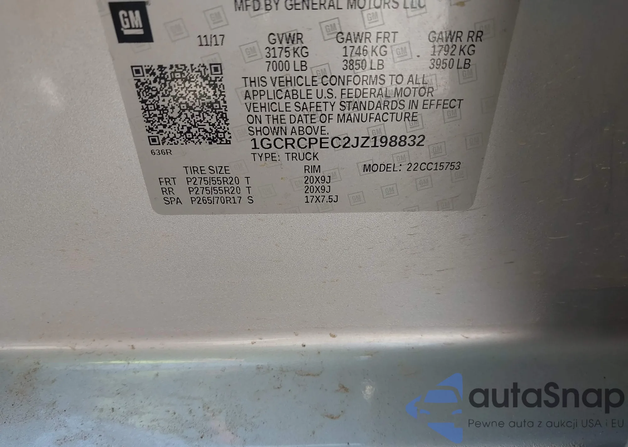 LOT: 42975598 VIN: 1GCRCPEC2JZ198832