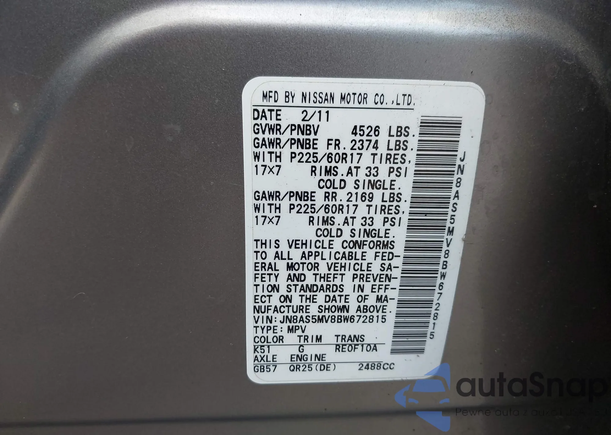 LOT: 43105716 VIN: JN8AS5MV8BW672815