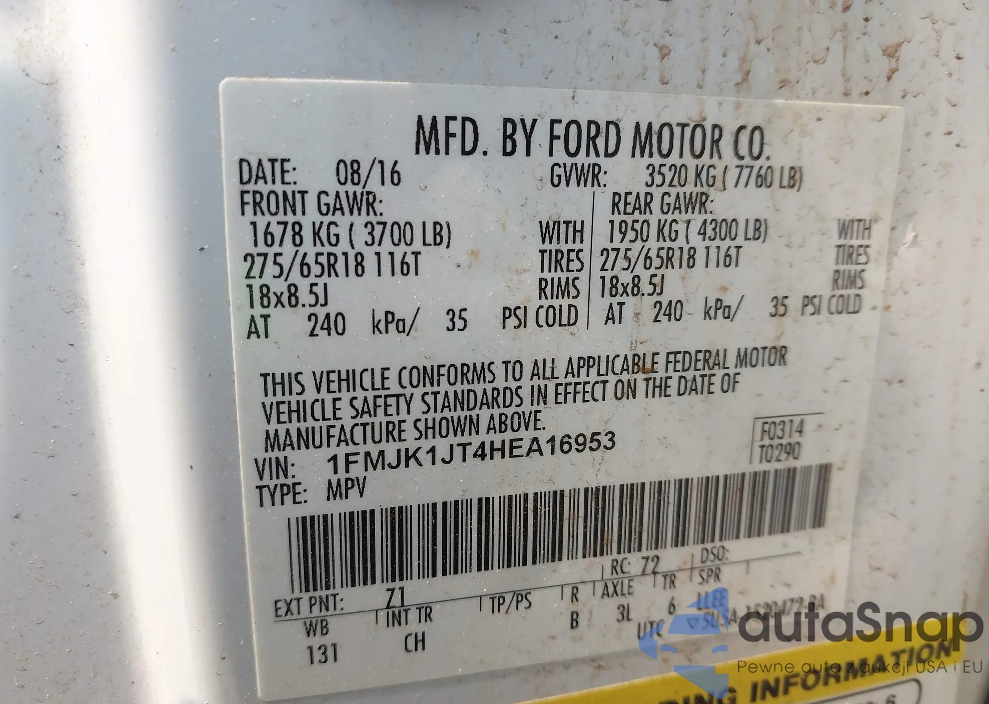 LOT: 42920008 VIN: 1FMJK1JT4HEA16953