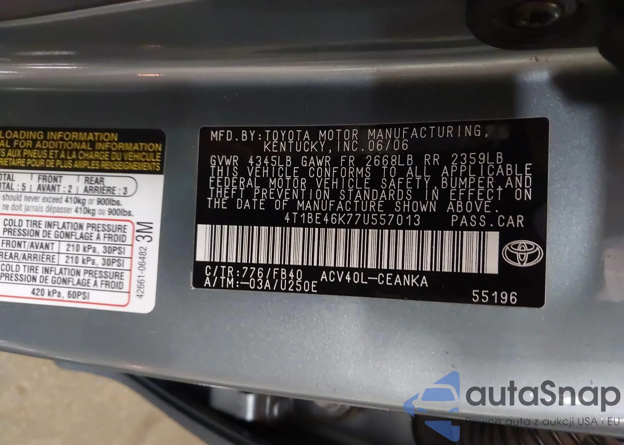 LOT: 42862784 VIN: 4T1BE46K77U557013