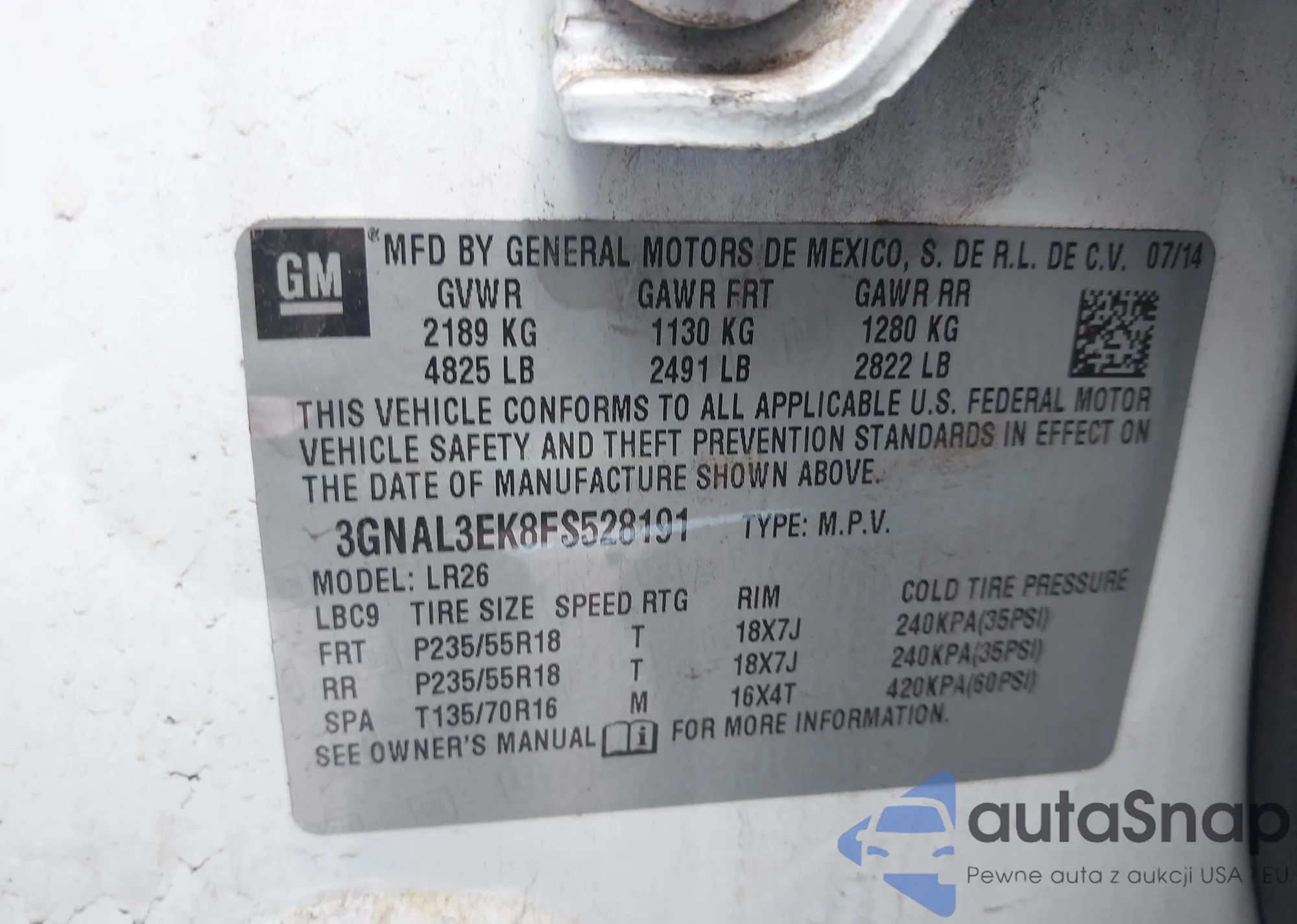 • VIN 3GNAL3EK8FS528191
