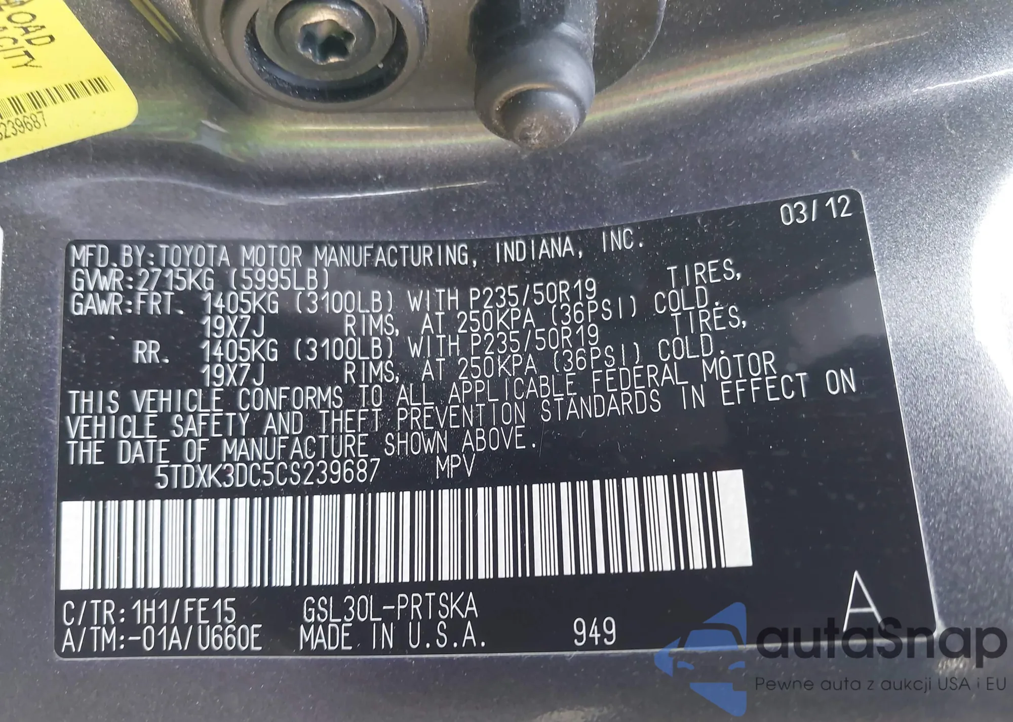 LOT: 42984379 VIN: 5TDXK3DC5CS239687