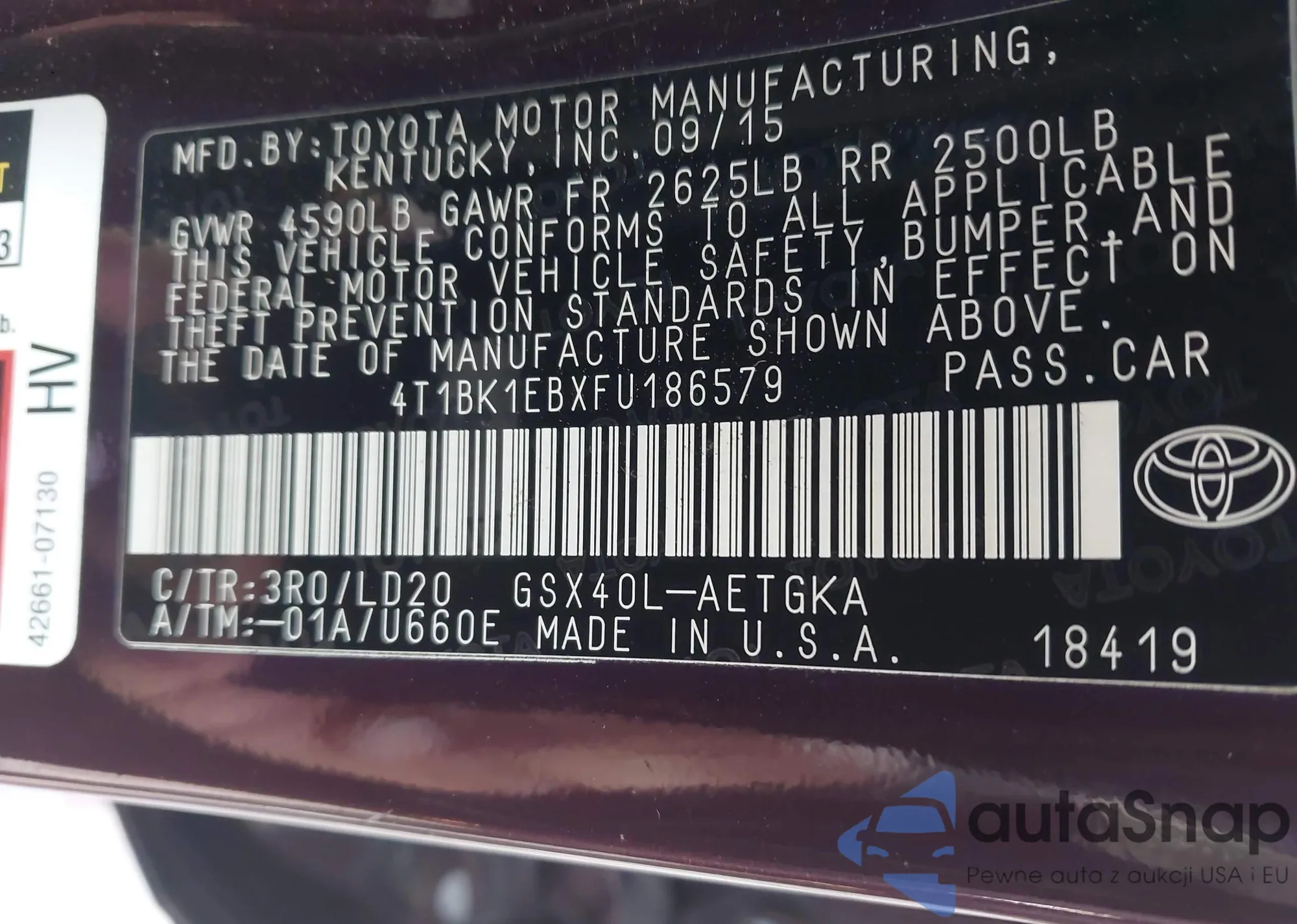LOT: 43143249 VIN: 4T1BK1EBXFU186579