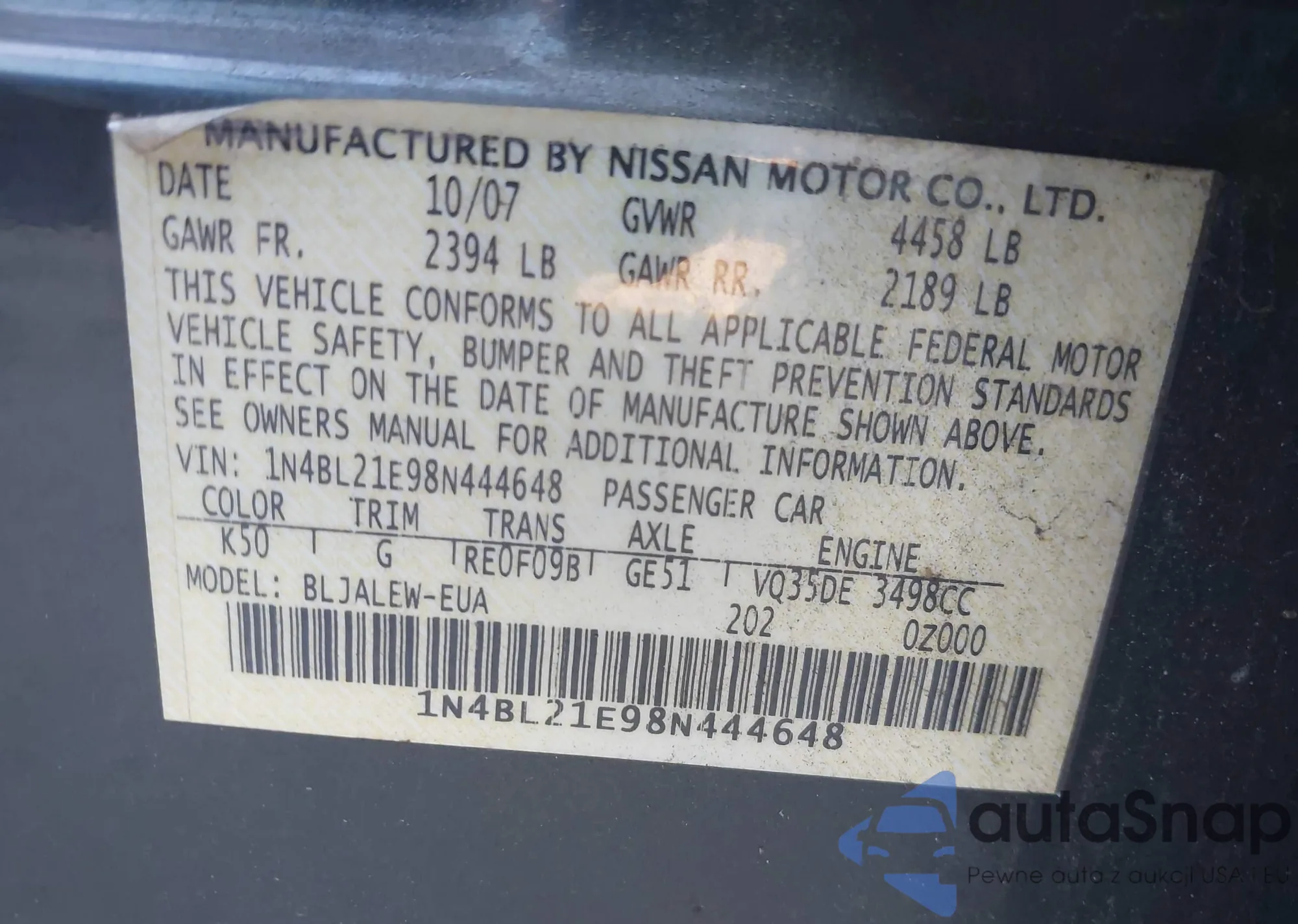 LOT: 43211496 VIN: 1N4BL21E98N444648