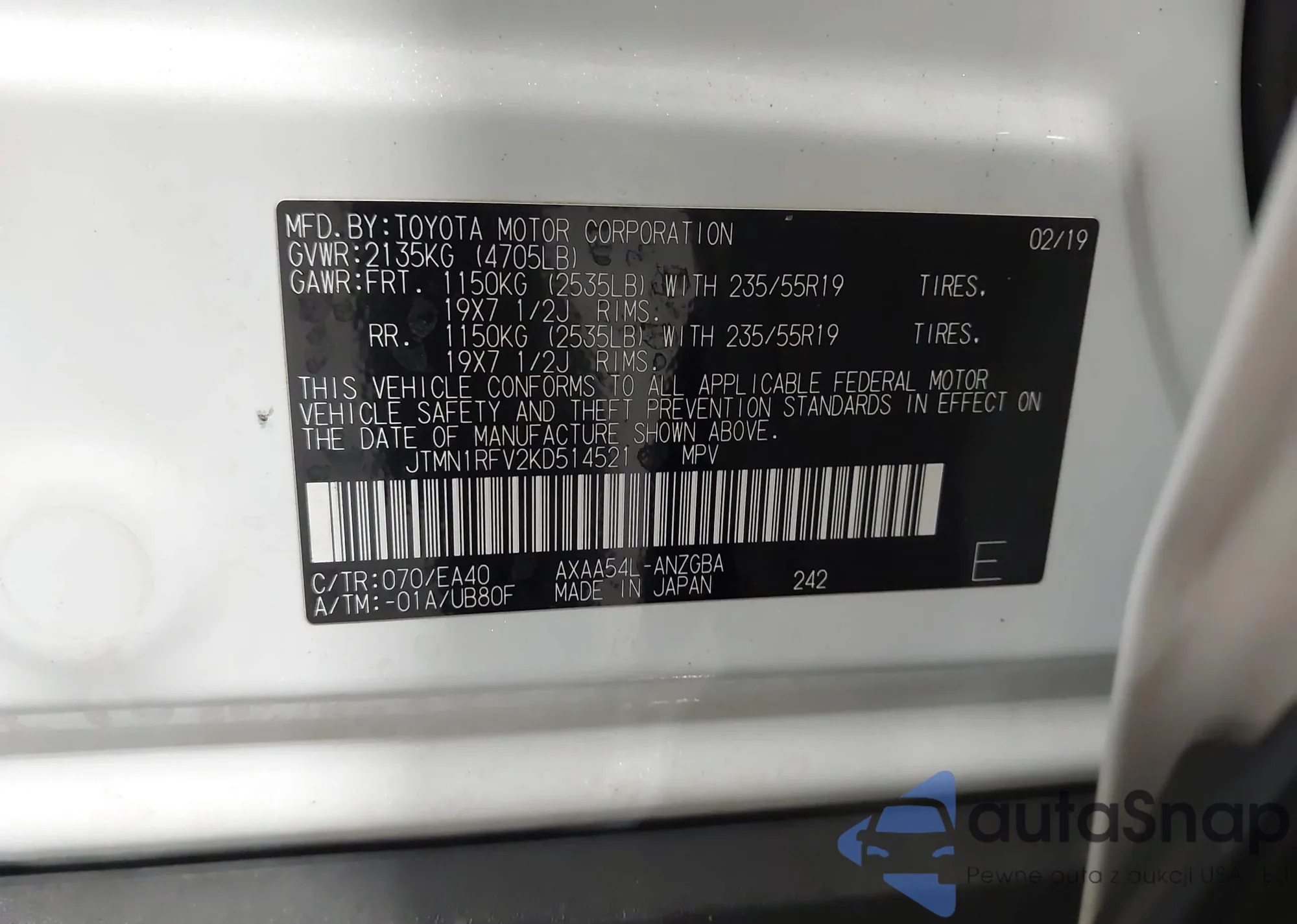 LOT: 43170208 VIN: JTMN1RFV2KD514521