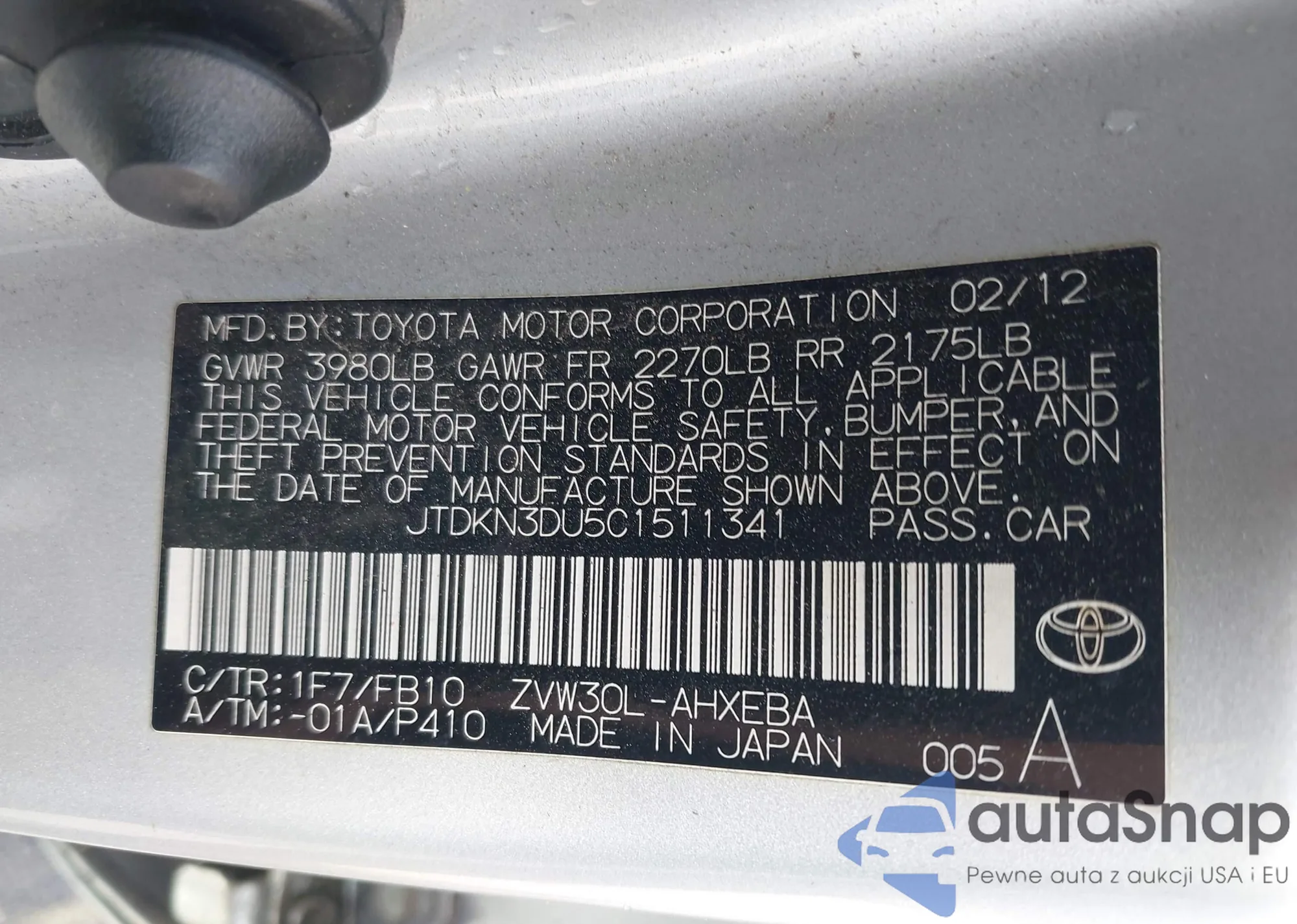 LOT: 43188485 VIN: JTDKN3DU5C1511341