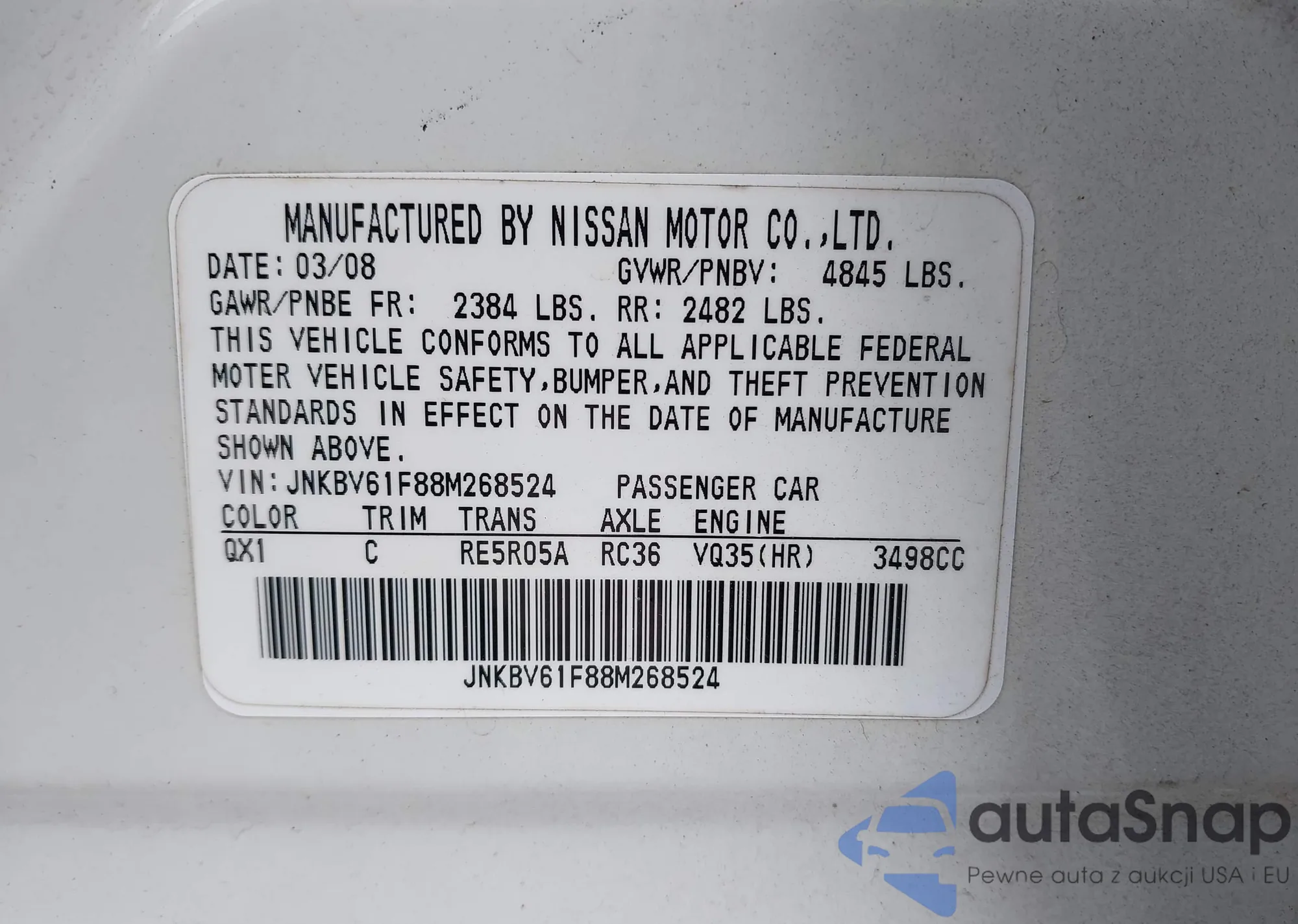2008 Infiniti G35X z USA, uszkodzony, nr VIN JNKBV61F88M268524