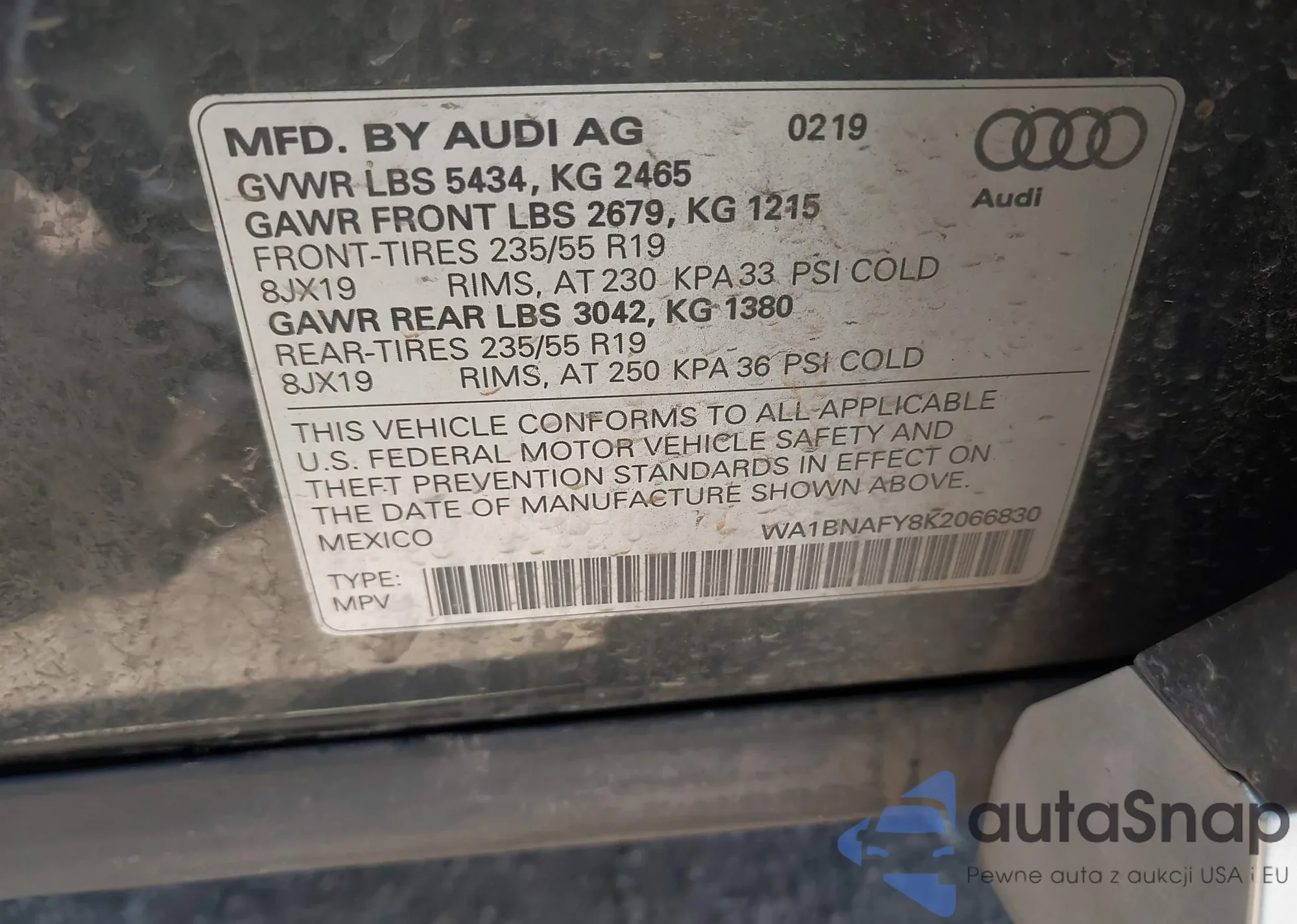 LOT: 42915914 VIN: WA1BNAFY8K2066830