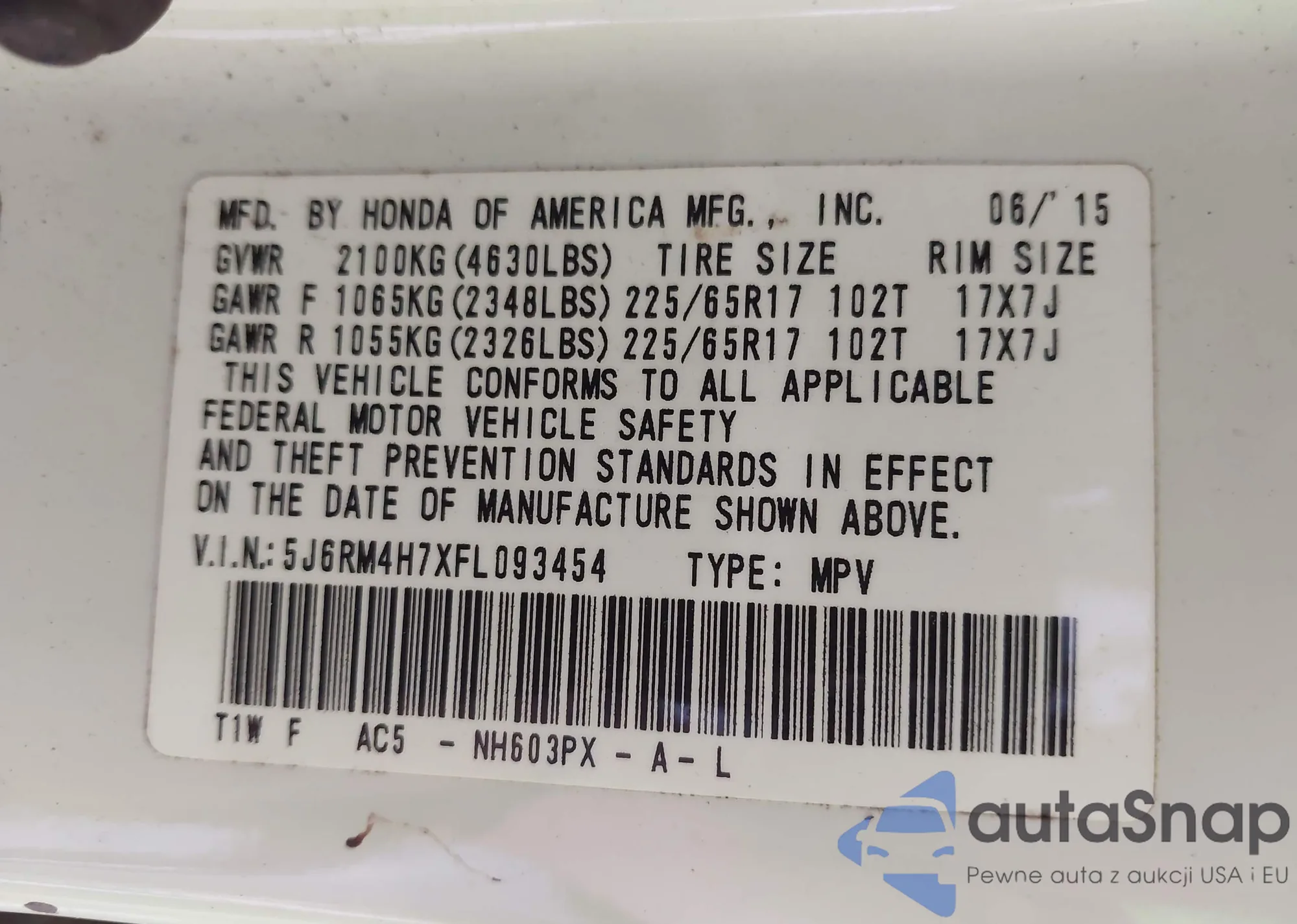 • VIN 5J6RM4H7XFL093454