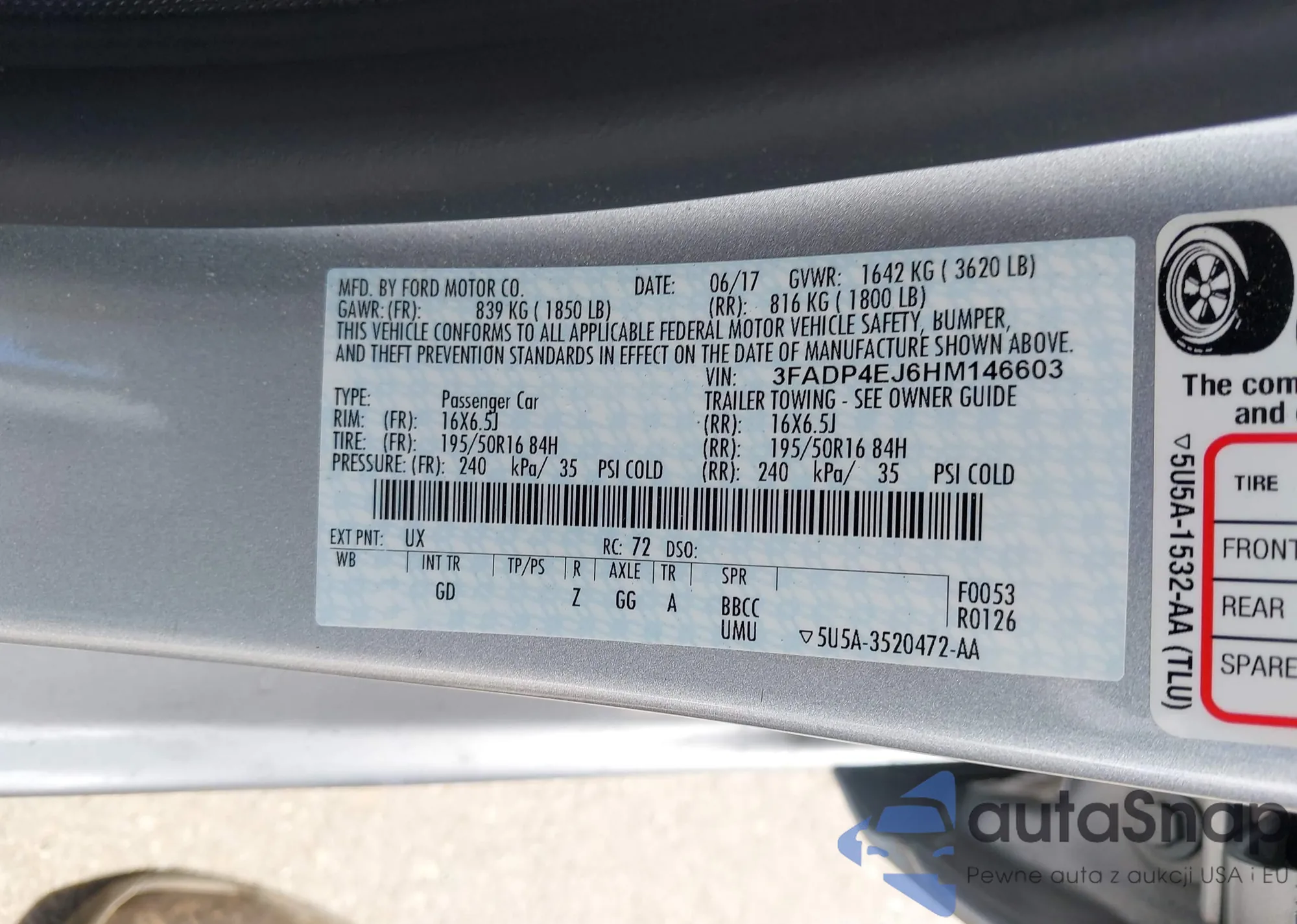 LOT: 42667169 VIN: 3FADP4EJ6HM146603