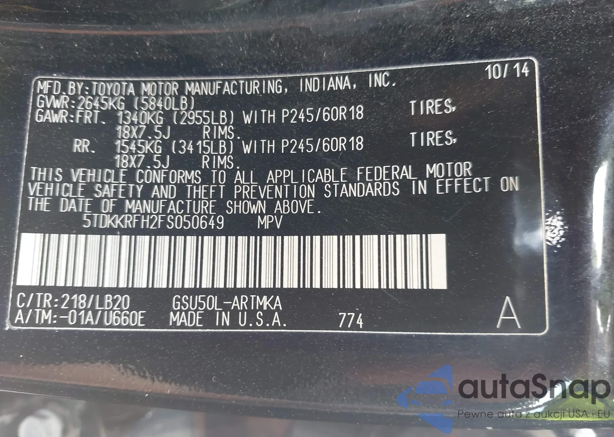 LOT: 42894882 VIN: 5TDKKRFH2FS050649