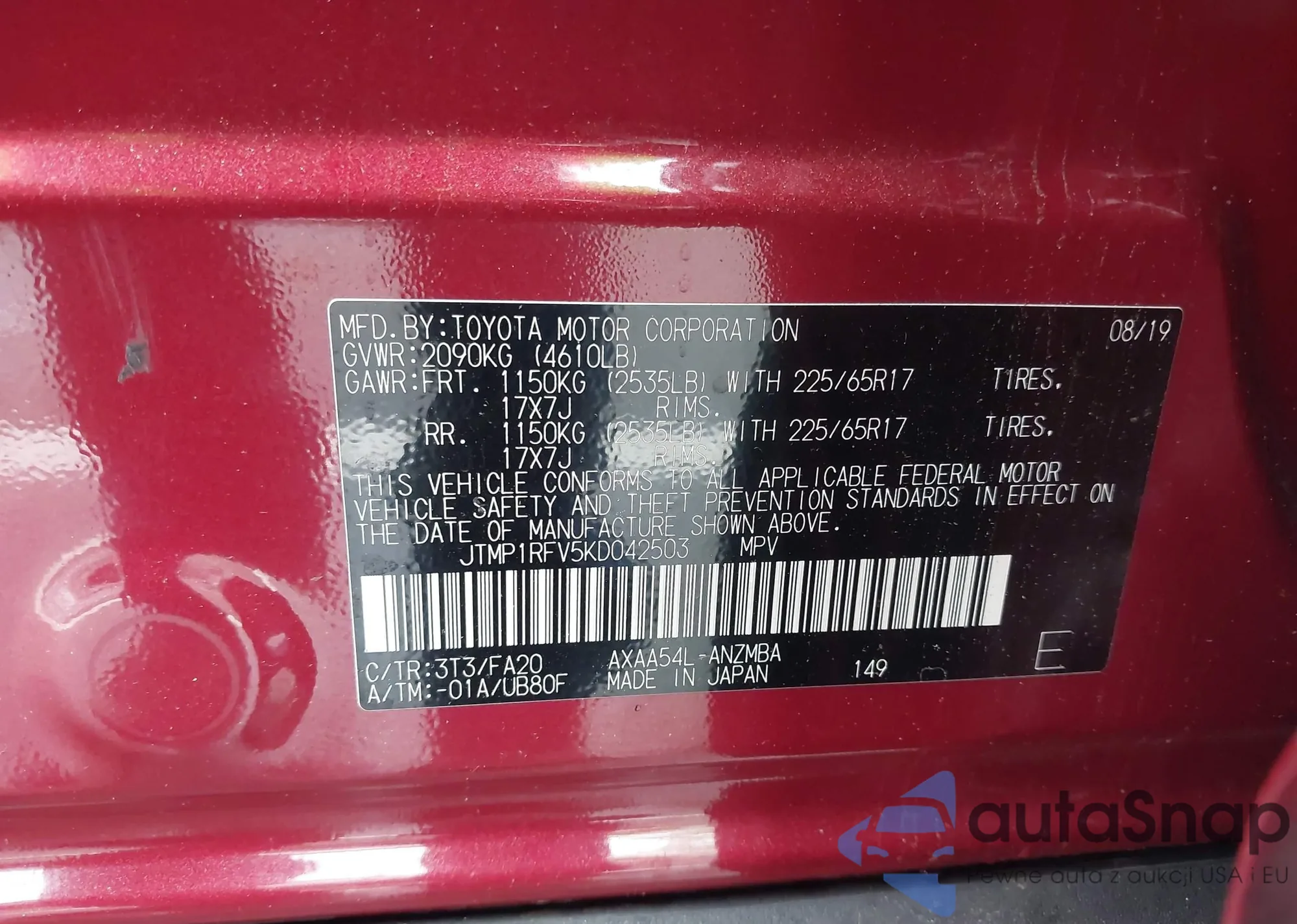 LOT: 42190256 VIN: JTMP1RFV5KD042503