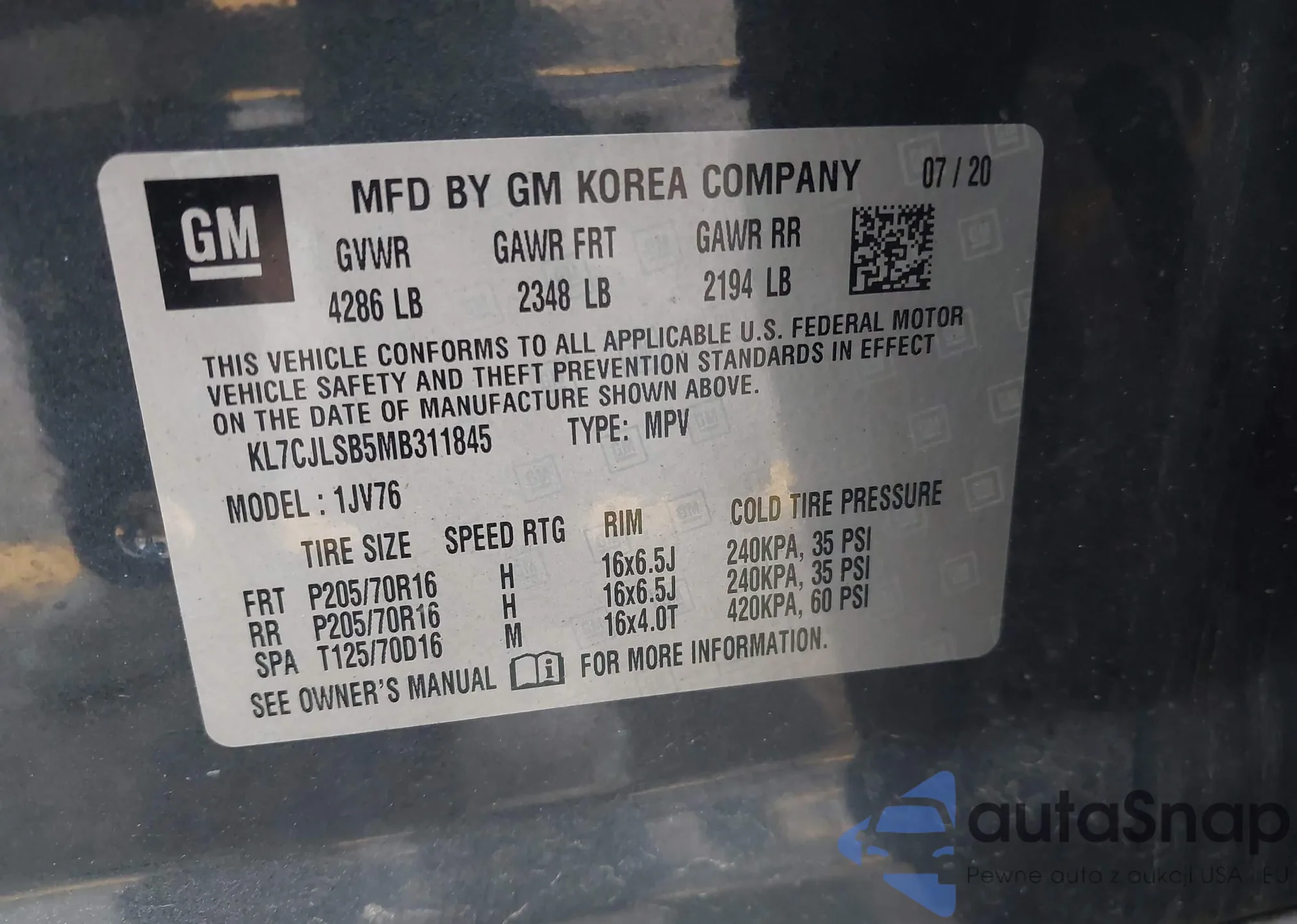 • VIN KL7CJLSB5MB311845