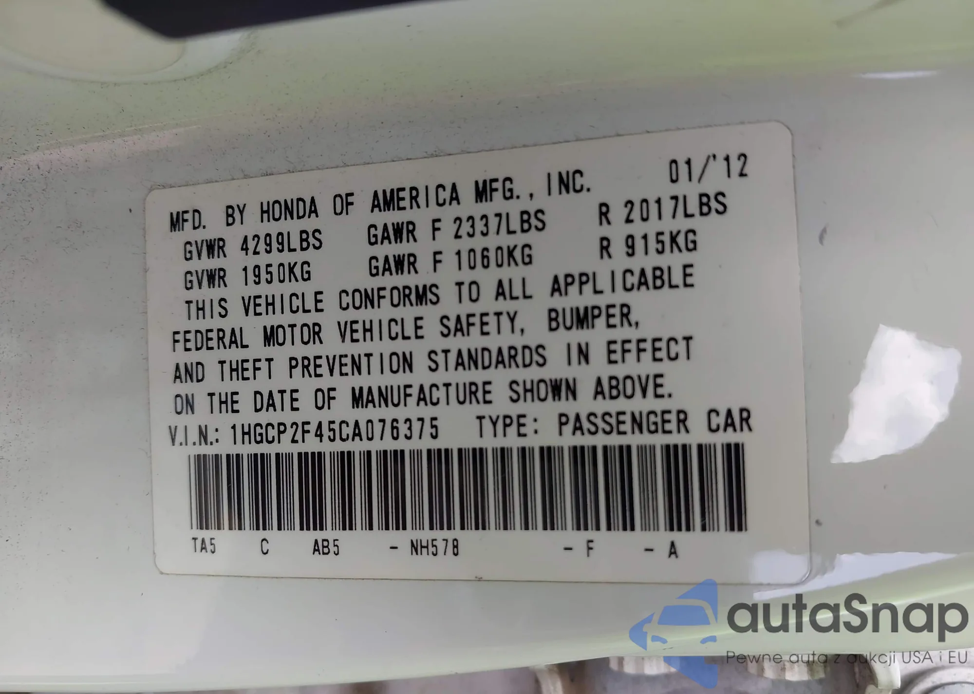 LOT: 42518685 VIN: 1HGCP2F45CA076375