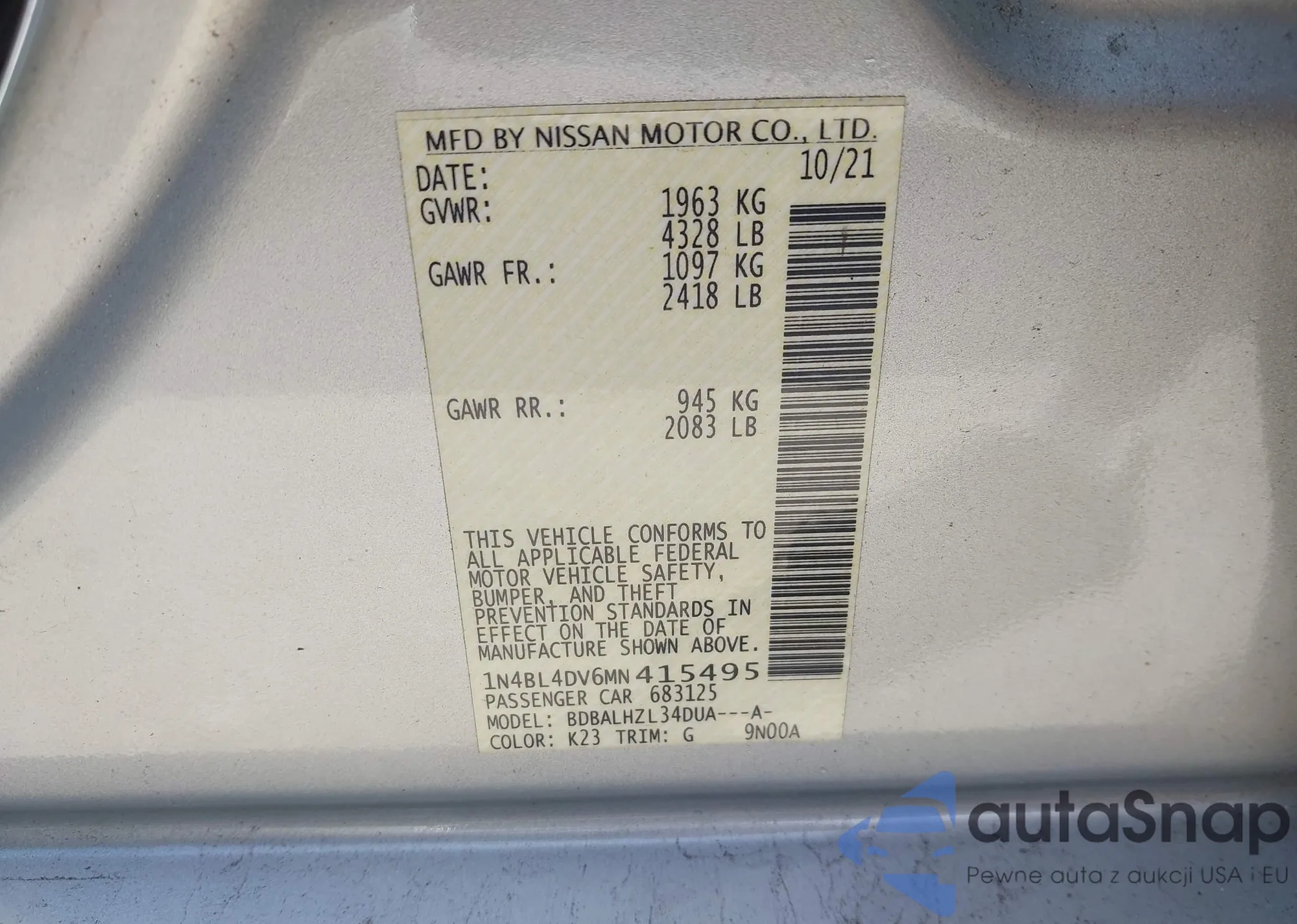 LOT: 42537211 VIN: 1N4BL4DV6MN415495