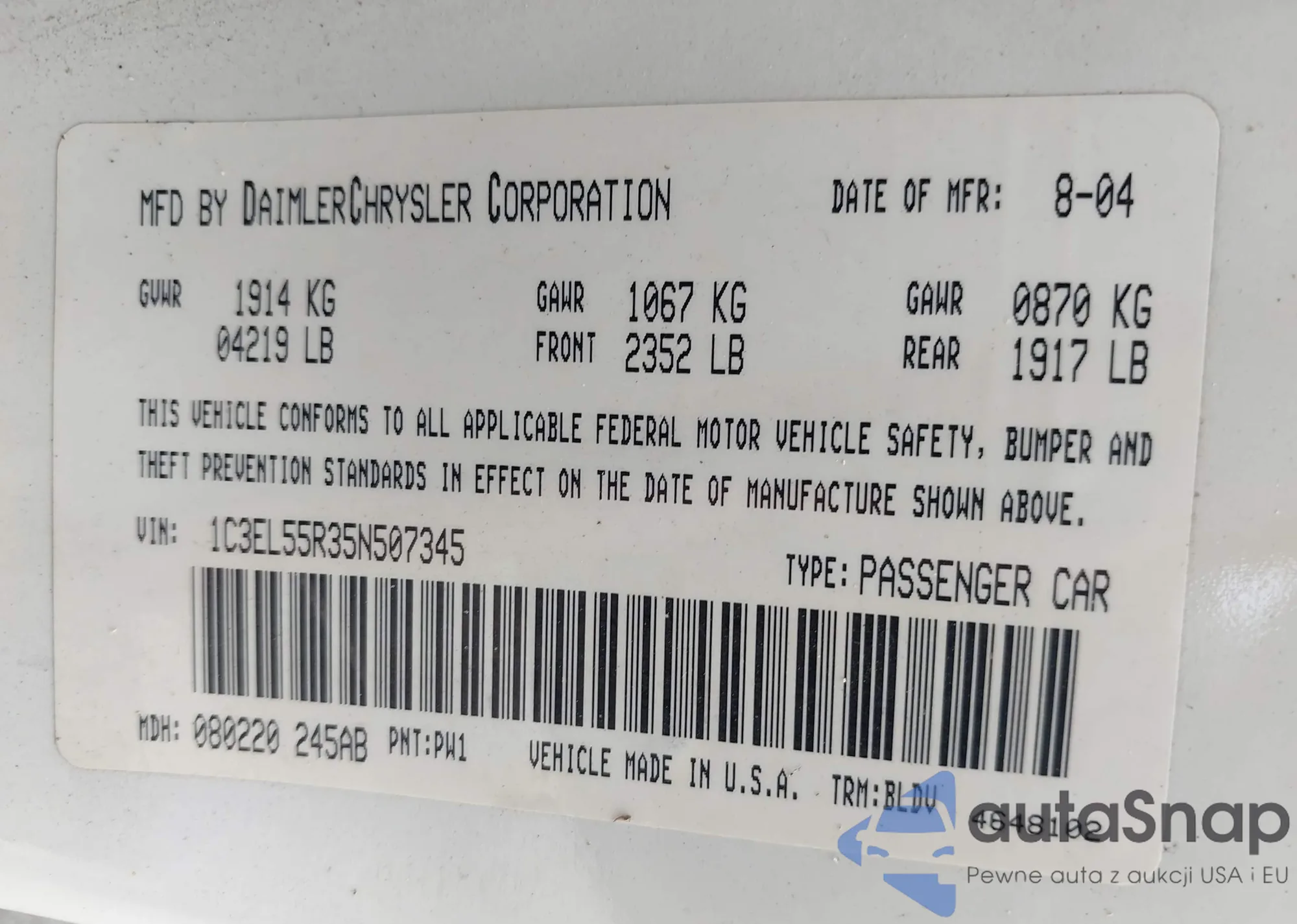 • VIN 1C3EL55R35N507345