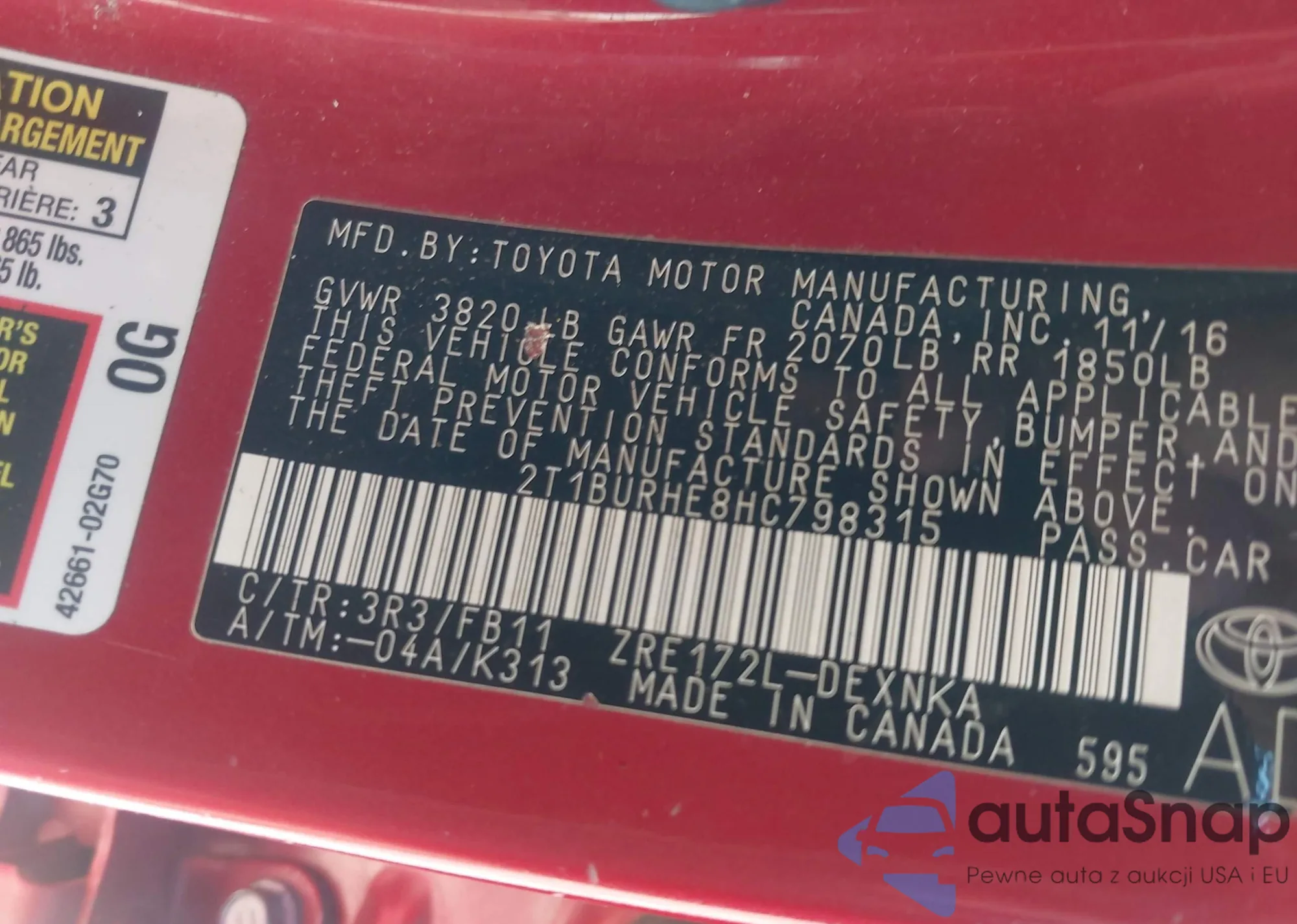 LOT: 43019847 VIN: 2T1BURHE8HC798315