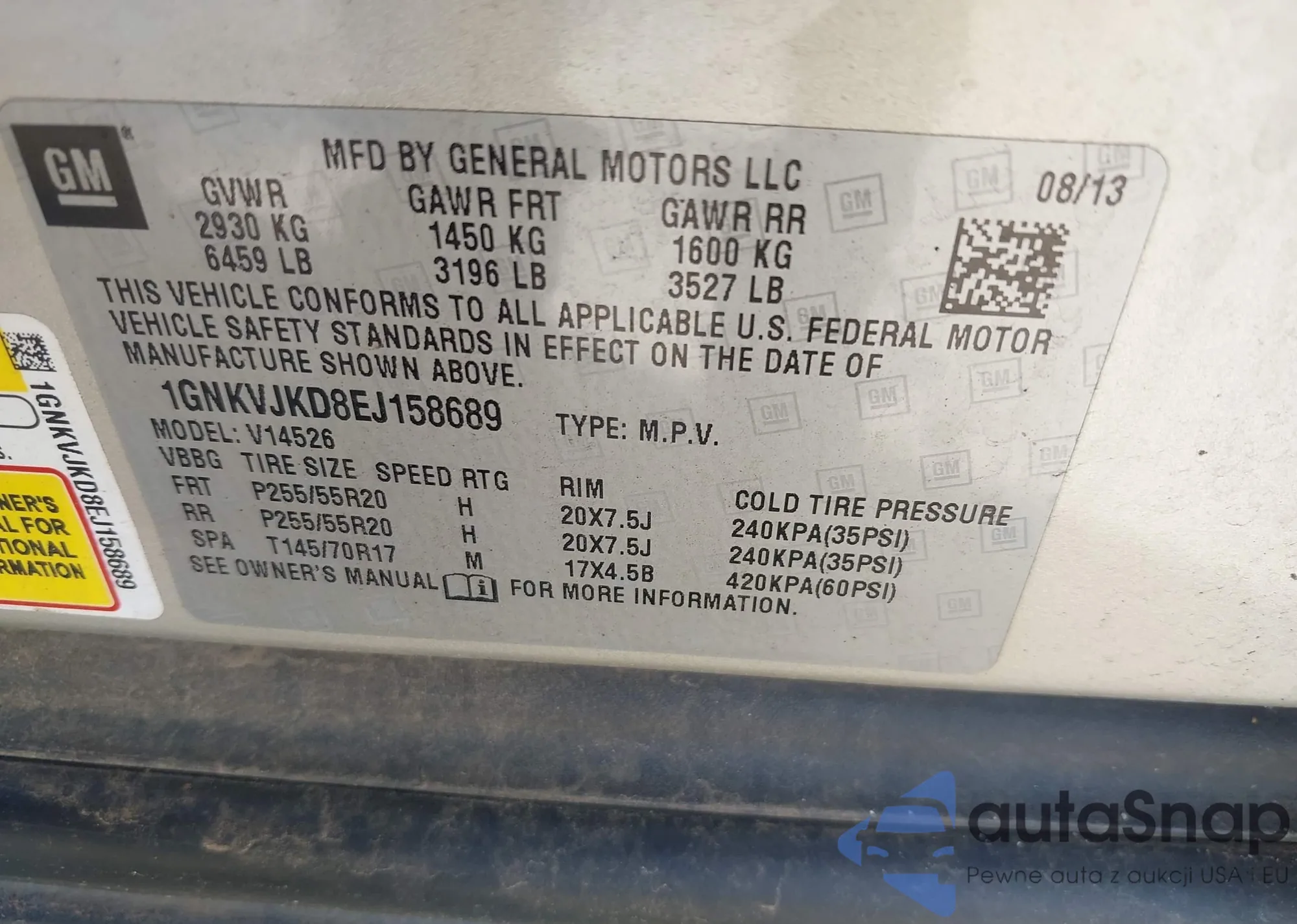 LOT: 43038655 VIN: 1GNKVJKD8EJ158689