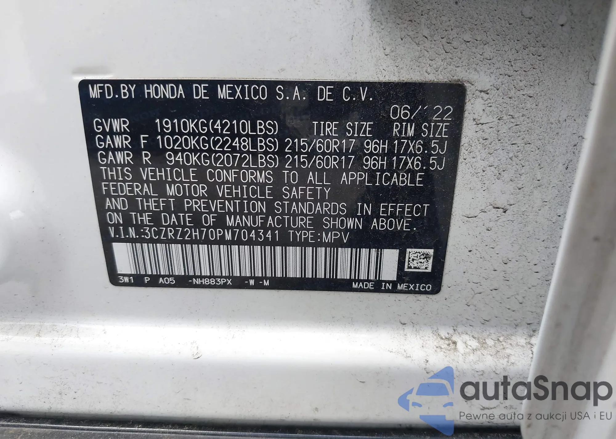 • VIN 3CZRZ2H70PM704341