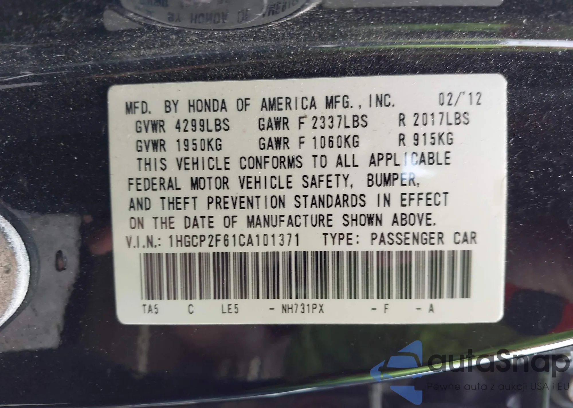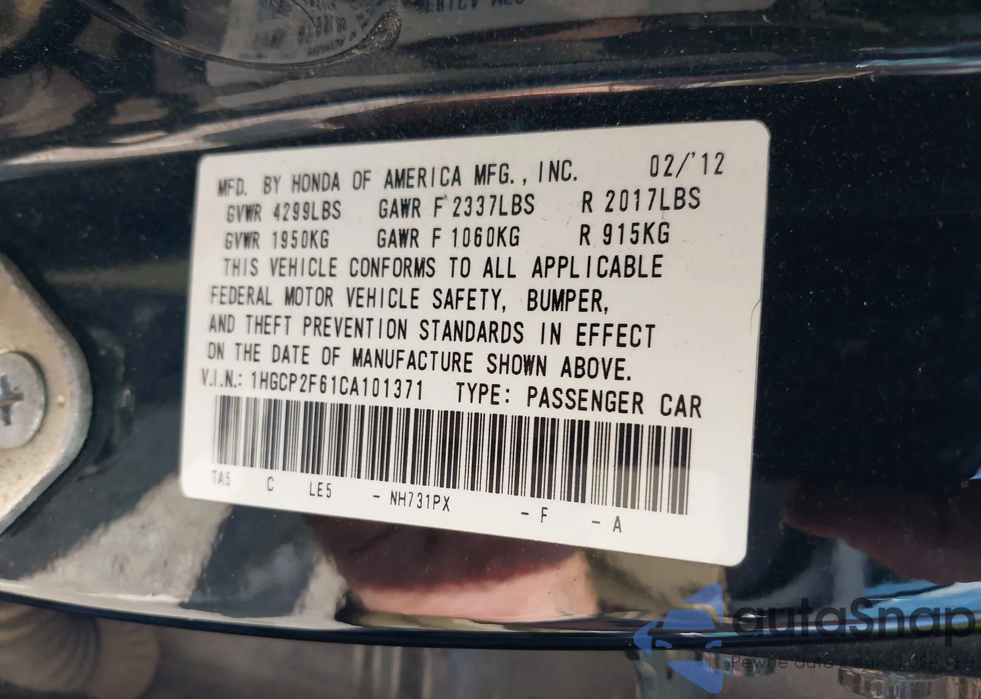 LOT: 42915097 VIN: 2HGFA1F8XBH539445