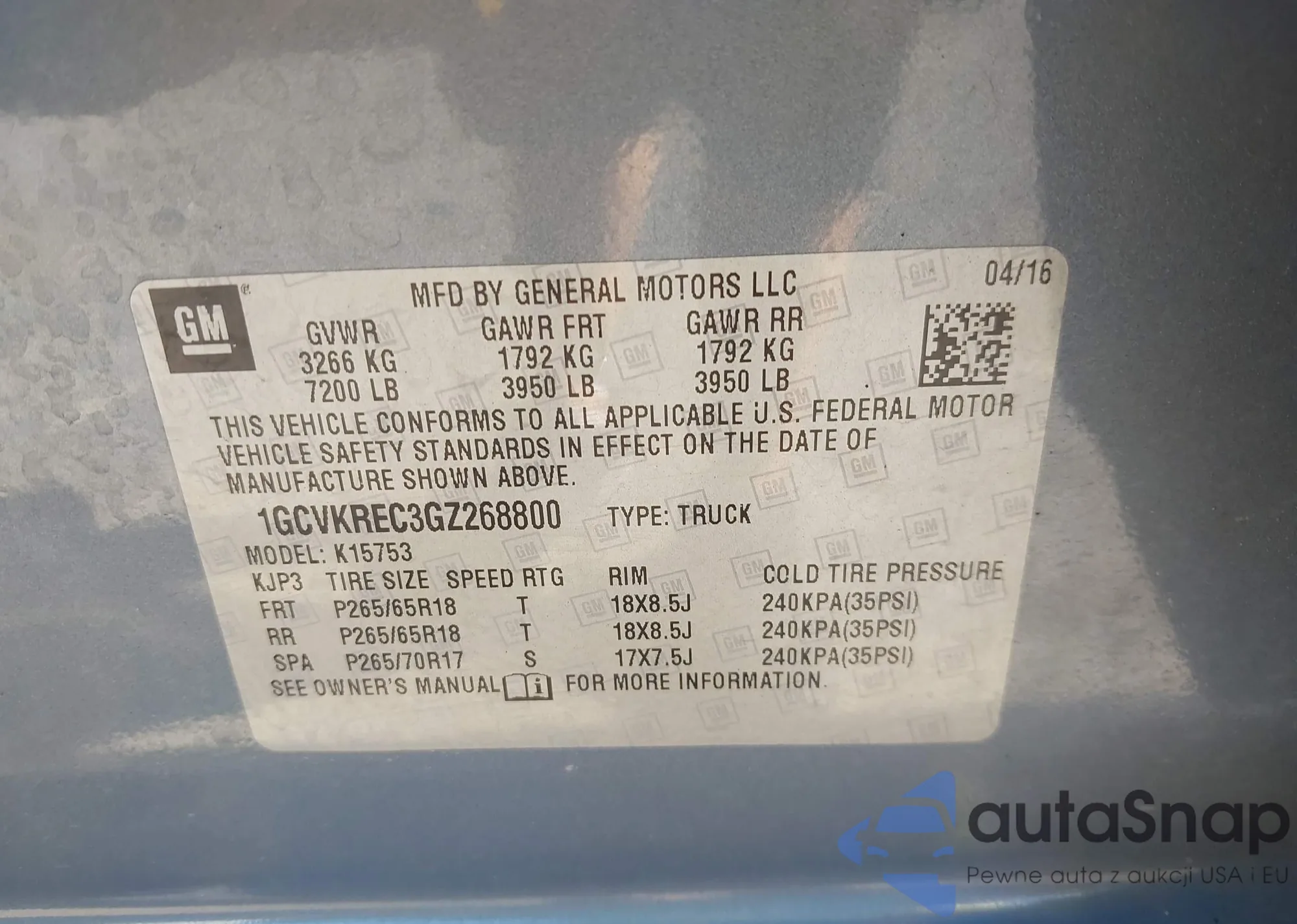 LOT: 43098786 VIN: 1GCVKREC3GZ268800