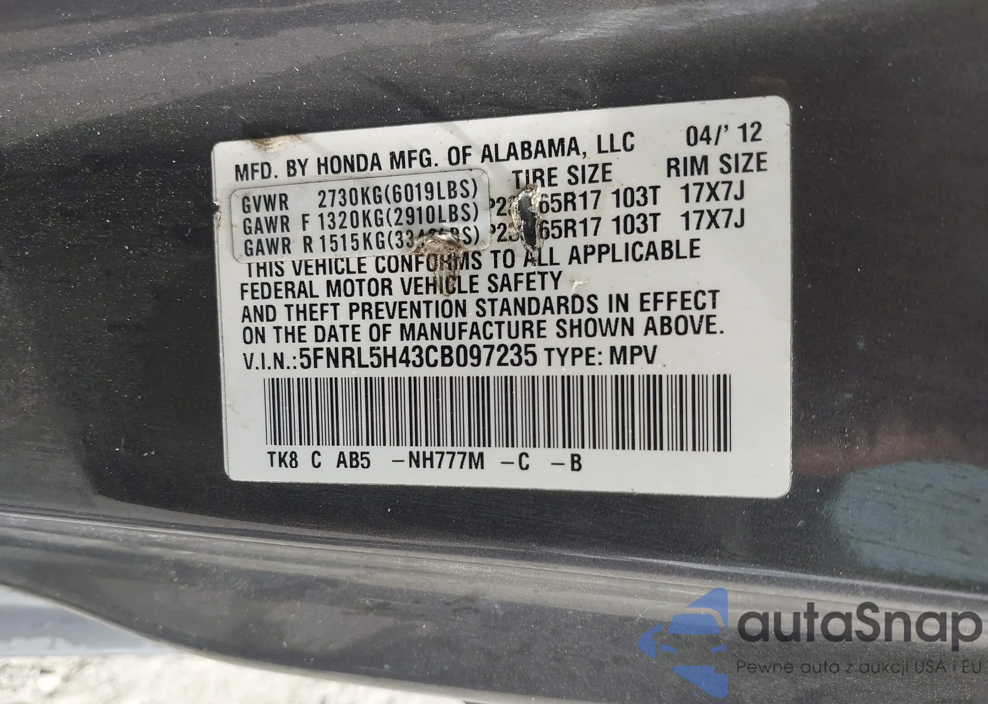 • VIN 5FNRL5H43CB097235
