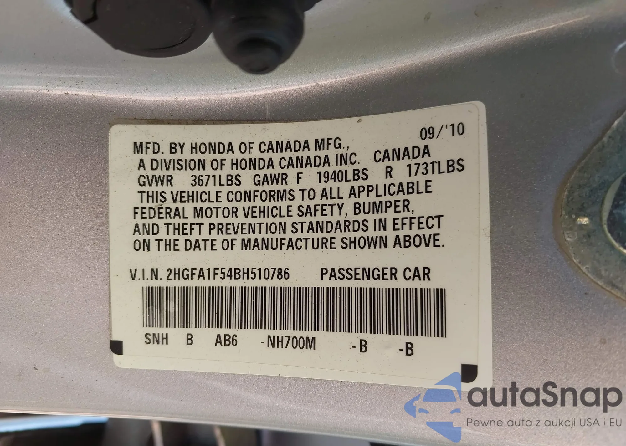 • VIN 2HGFA1F54BH510786