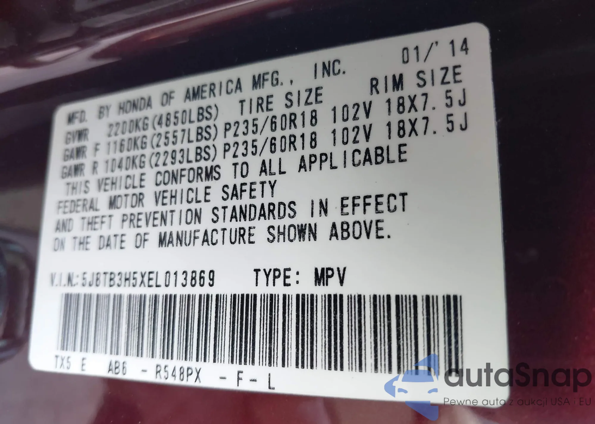 • VIN 5J8TB3H5XEL013869