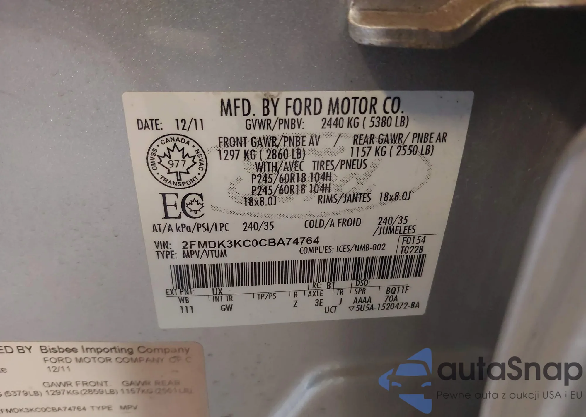 • VIN 2FMDK3KC0CBA74764
