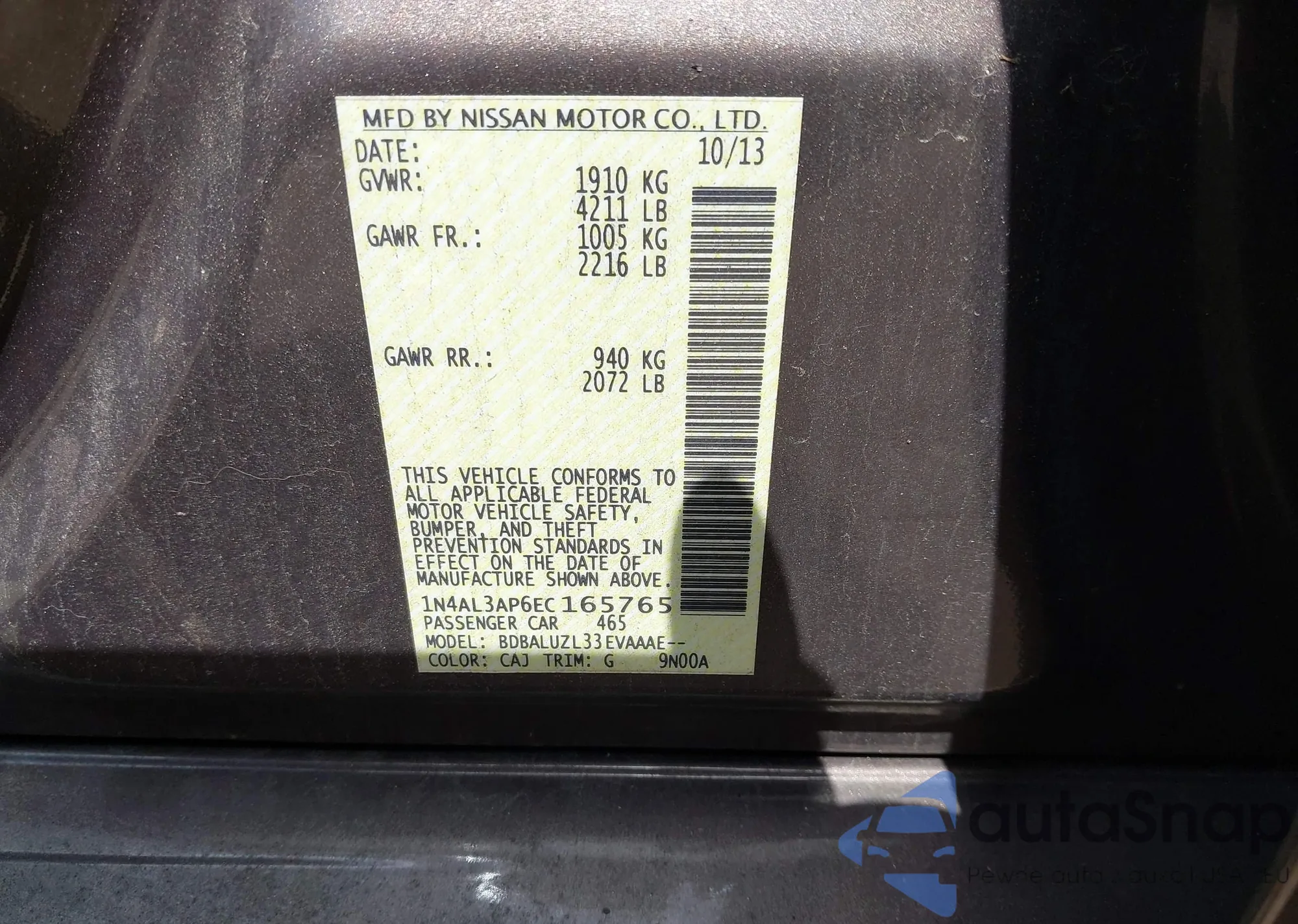• VIN 1N4AL3AP6EC165765