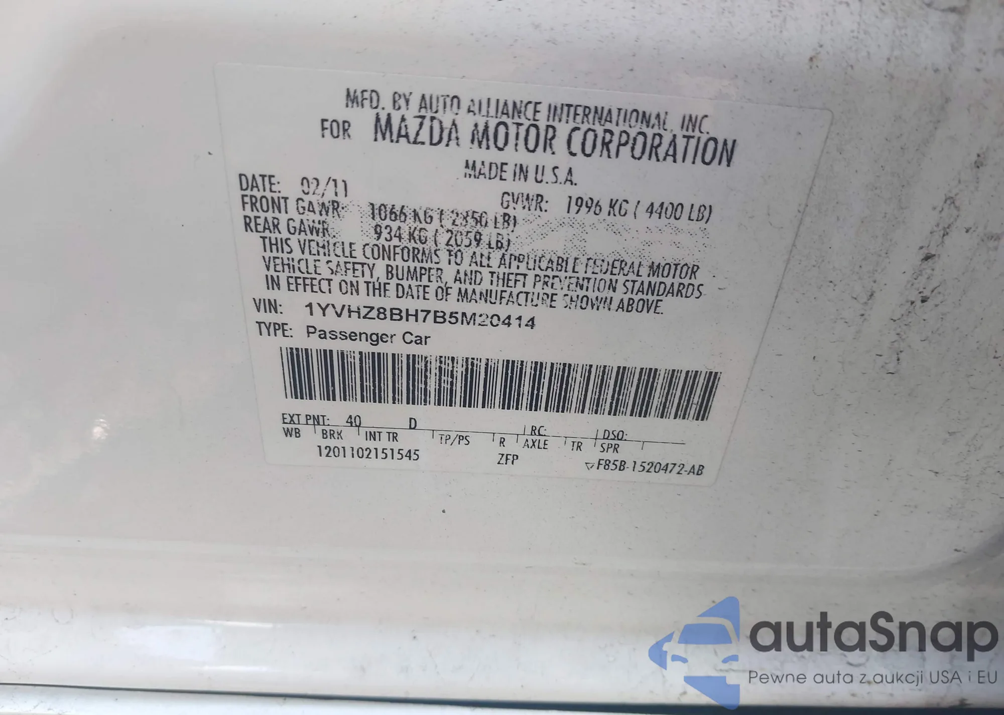 • VIN 1YVHZ8BH7B5M20414